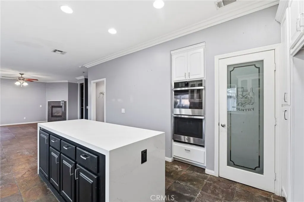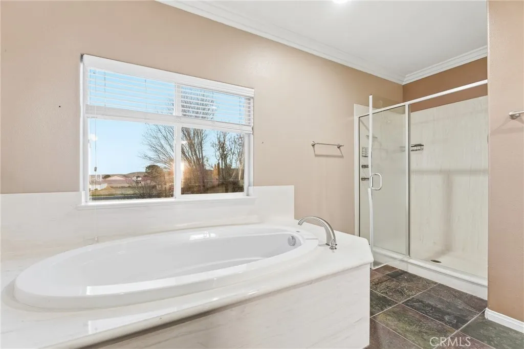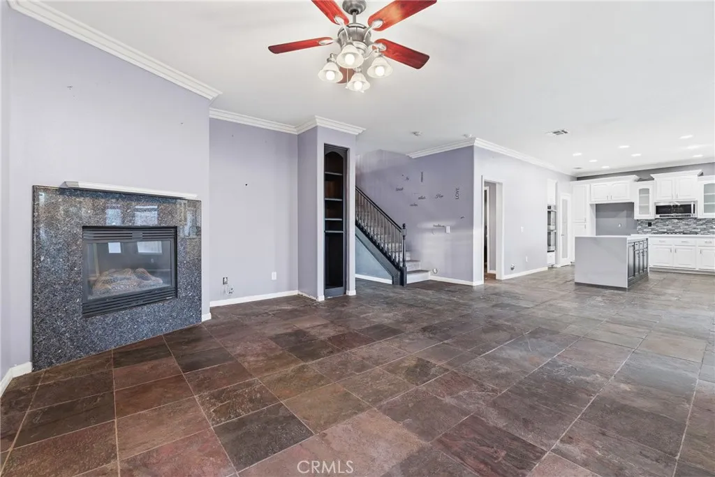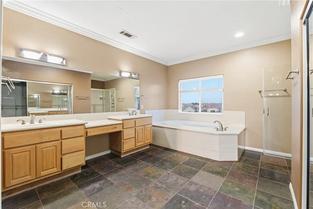 Welcome to this spacious 4-bedroom, 2.5-bath home offering approximately 2,677 sq. ft. of well-designed living space, located within a desirable HOA community featuring a 27-hole golf course, clubhouse, pool, tennis courts, restaurants, stores, and more. 2 car garage with expanded drive way. The inviting living room features a cozy fireplace, while the separate family room provides additional space for everyday living and entertaining. The upgraded kitchen is a true centerpiece, complete with an expanded waterfall island, double ovens, stainless steel appliances, and a walk-in pantry—perfect for both cooking and hosting. Elegant crown molding flows throughout the home, adding a refined touch to every room. Slate flooring throughout the downstairs. The primary suite is a private retreat, featuring its own fireplace and an expansive ensuite bathroom with a large walk-in shower, soaking tub, dual sinks, a walk-in closet, and a private toilet area. Step outside to a beautifully landscaped backyard designed for both relaxation and function, featuring a spa, Alumawood patio cover, vinyl fencing, a fenced dog run, RV parking area, and a storage shed. Additional highlights include solar for energy efficiency. Enjoy the convenience of resort-style community amenities paired with the comfort, space, and upgrades of this exceptional home—a perfect blend of lifestyle and functionality, ready to be enjoyed.