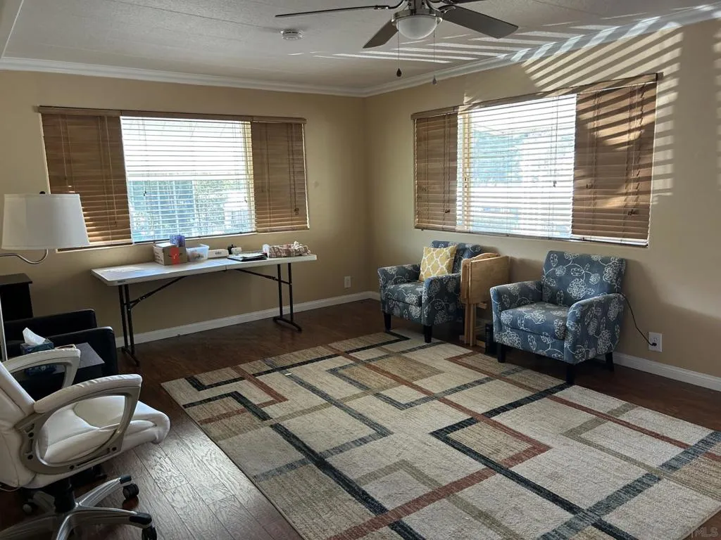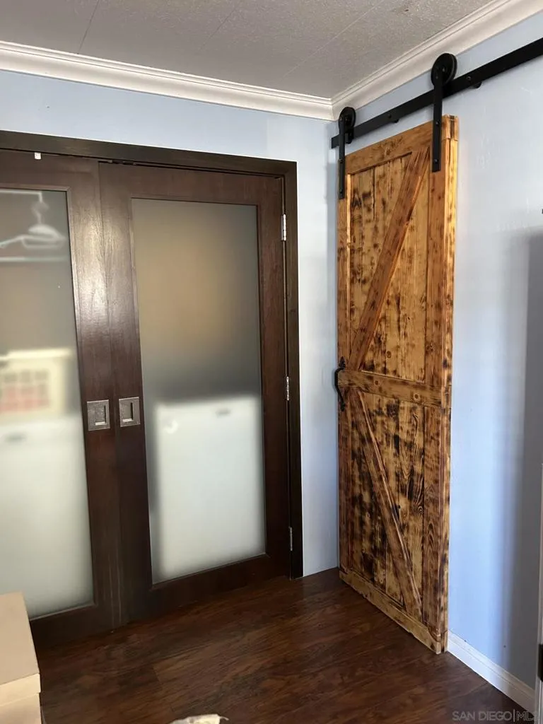 Beautiful upgrades to flooring/crown molding/bullnosed corners/upgraded laundry room with beautiful double doors and master bath with sliding barn door! Master bathroom has tub with upgraded glass enclosure, new tile & pedestal sink. Full size washer and dryer in laundry closet. This home boasts of light, flowing open floorplan that includes a separate dining area. The galley kitchen is conveniently located toward the front of home with windows facing the street and carport. The carport is tandem for 2 or 3 cars and is wired for EV! There is a generous covered patio and LARGE 12x10 wood storage building in the backyard. HCD registered for low annual taxes (not local taxes)!