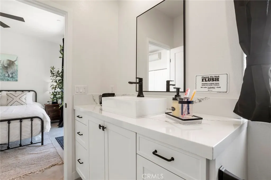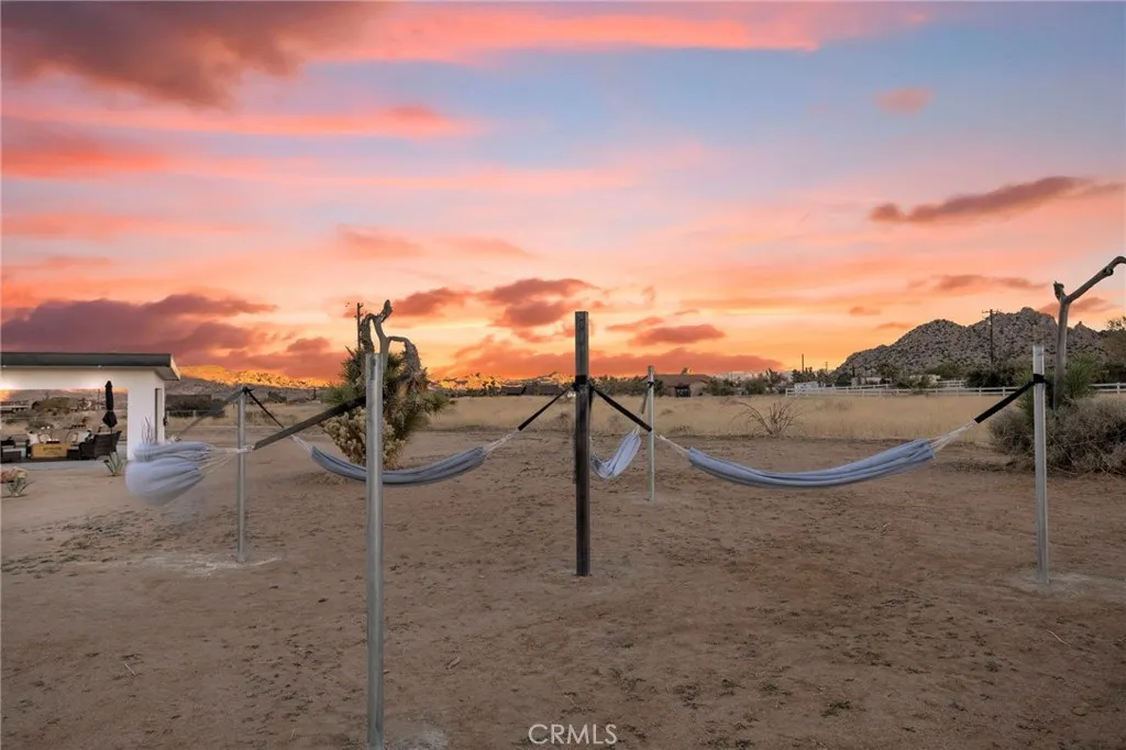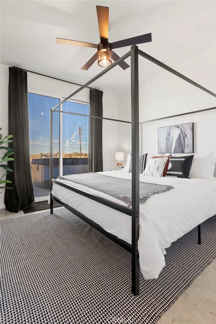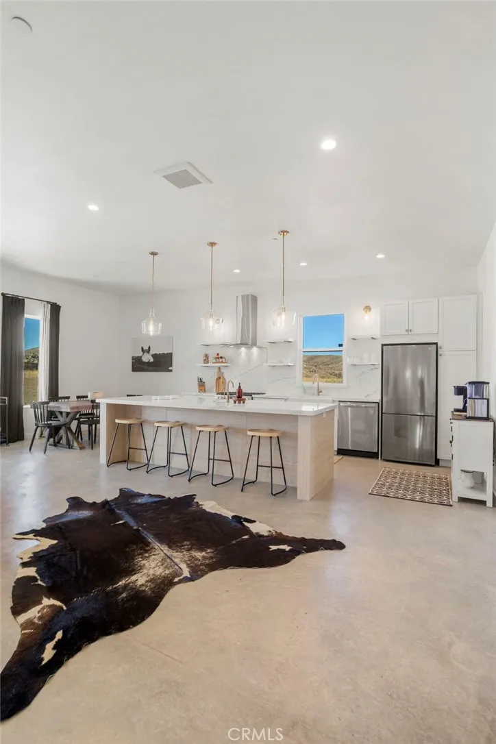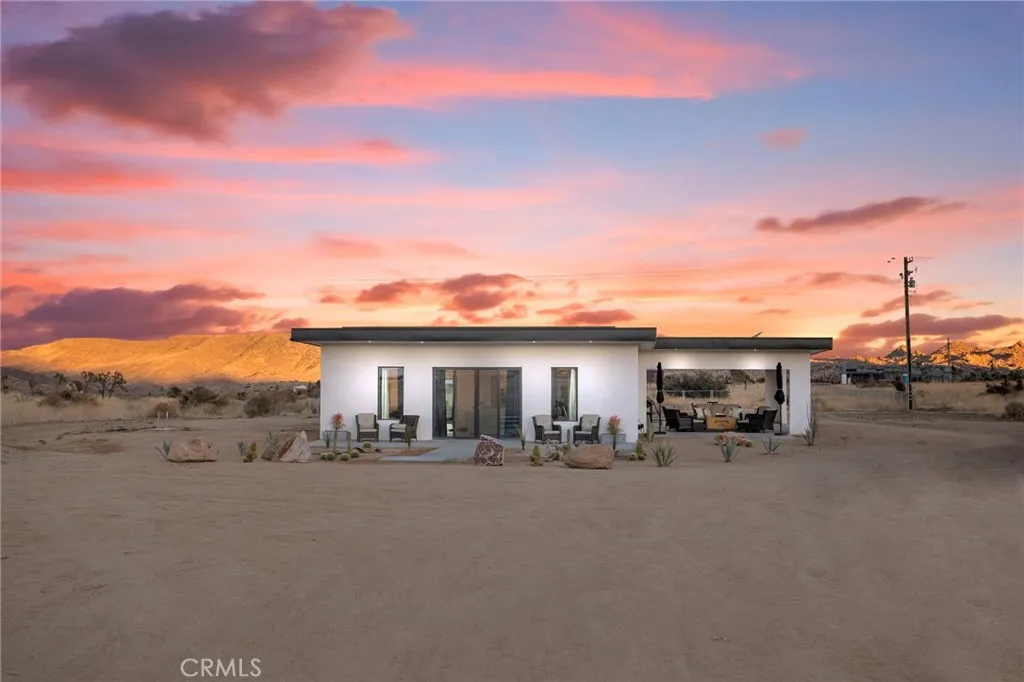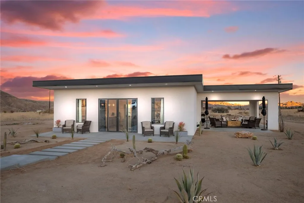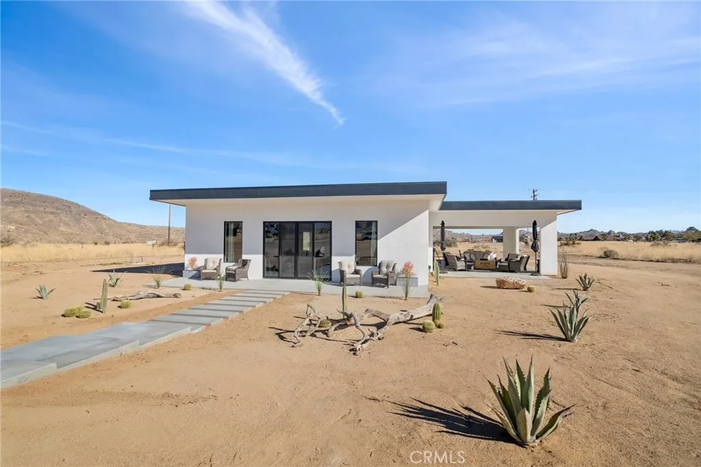 Welcome to Tom Mix Road, a striking architectural desert retreat located just a short distance from Pioneertown and its iconic dining, entertainment, and High Desert attractions. This tastefully designed property is currently used as a vacation rental and offers a unique blend of modern finishes and dramatic natural surroundings. The home features finished concrete flooring, soaring ceilings, and an expansive great room filled with natural light. The kitchen is designed for both function and style, showcasing a large center island, upgraded cabinetry, slide-in five-burner stainless steel range, dishwasher, refrigerator, farmhouse sink, and statement stainless and glass hood. The open dining area sits just off the island, creating an ideal layout for entertaining. Large sliding glass doors open to breathtaking desert landscape views, including surrounding boulder formations and distant mountain vistas toward the backside of Big Bear within the San Bernardino Mountains. Outdoor living spaces include multiple patio areas and a private rear yard with spa and hot tub, ideal for relaxing under desert night skies. Additional property upgrades include paid-off solar, a 400-amp electrical panel, full RV hookups, metered water service, and an EV charging station, adding functionality and efficiency for a variety of potential uses. Bathrooms are highly upgraded with glass shower enclosures, modern fixtures, wall-mounted sinks, and marble-style countertops with gold accents. The primary suite includes its own en-suite bathroom with custom shower enclosure and private patio access. Each bedroom includes ceiling fans and designer lighting. The secondary bedroom offers private slider access to the rear yard and convenient access to a shared bathroom. Buyer to verify all uses, rental guidelines, and zoning to their satisfaction.