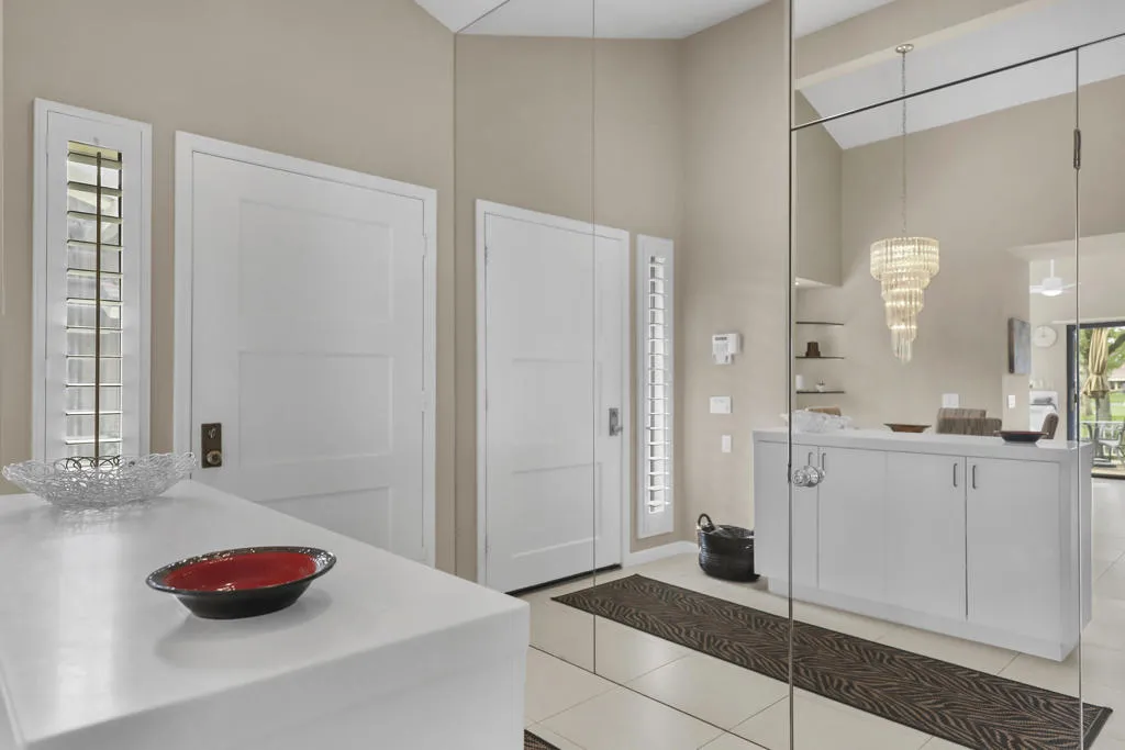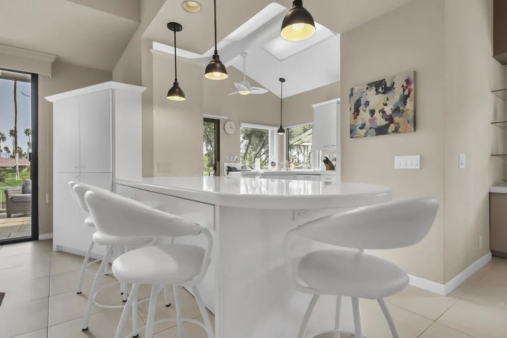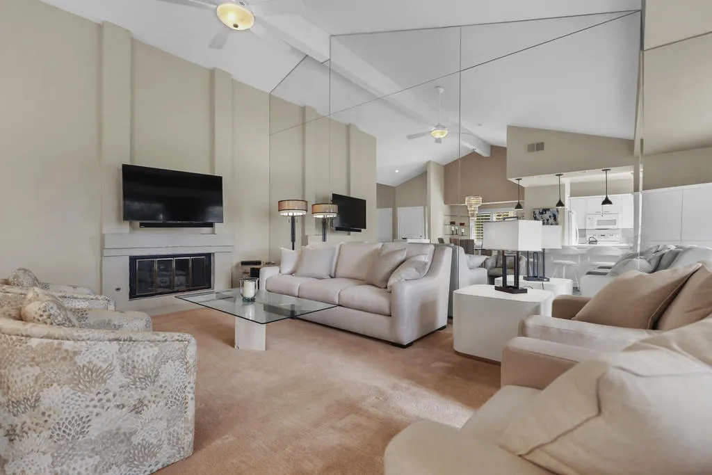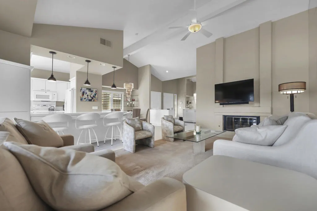 Light-filled and beautifully updated, this 2 bedroom, 2 bath condo with a den is ideally located within The Lakes Country Club. Thoughtfully opened up with several walls removed, the home features a gleaming white kitchen, bright living room with fireplace, and an atrium converted to an office for additional usable space--creating an airy, modern feel throughout. Enjoy an east-facing orientation with glorious morning sun and expansive double fairway, lake, and mountain views. Crisp white bathrooms enhance the fresh aesthetic, while the primary bedroom offers an added walk-in closet. The den includes custom cabinetry and functions perfectly as additional sleeping space. Outdoor living is highlighted by a fenced stamped concrete patio overlooking the panoramic views. Additional features include an interior laundry room with direct access to the attached 2-car garage and cart barn. The Lakes Country Club offers an exceptional lifestyle with 27 championship holes of golf, a state-of-the-art fitness center, tennis, pickleball, pop tennis, bocce ball, 44 pools and spas, a lap pool, and a stunning clubhouse with restaurants and bar service. Offered Furnished.