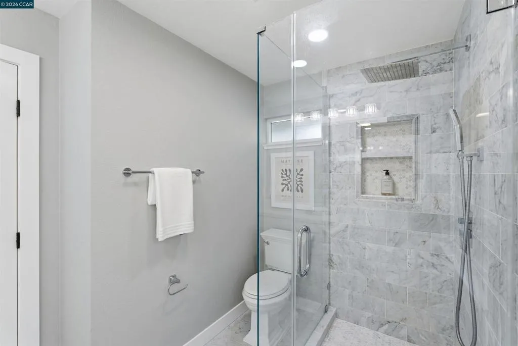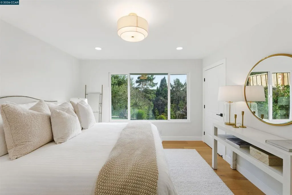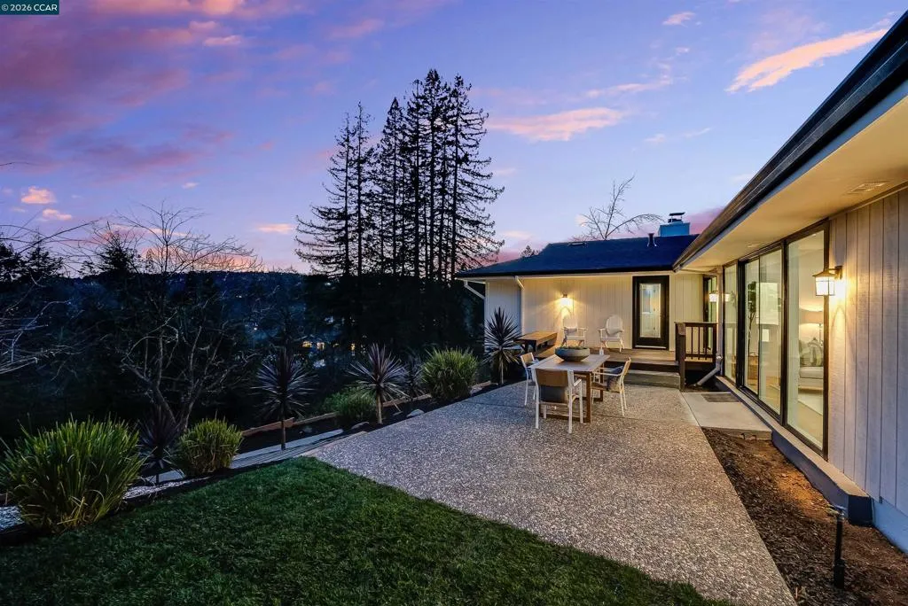 Experience elevated living in this beautifully remodeled 2,598± sq ft home offering five bedrooms and three baths in one of Moraga’s most desirable neighborhoods. The sun-filled living room features walls of glass, a striking stone and wood mantel fireplace, and seamless indoor-outdoor connection. The thoughtfully designed kitchen showcases white and gray cabinetry, quartz countertops, and sleek stainless-steel appliances and fixtures. Wide-plank engineered wood flooring, sophisticated interior paint, recessed lighting, and contemporary finishes enhance the home’s modern appeal. Expansive views extend from nearly every room, creating a bright and serene atmosphere. One level down, a spacious and versatile room provides flexibility for a family room, home office, gym, or guest space, complete with a private entrance to the backyard. Each bathroom is meticulously curated with designer tile, mirrors, fixtures, and lighting. Multiple outdoor spaces invite both entertaining and quiet relaxation, while the semi-private backyard offers a peaceful retreat. The finished garage features painted concrete flooring, and a separate rear storage area adds valuable functionality. Ideally located close to top-rated Moraga schools, parks, trails, shopping, and dining. Welcome Home!