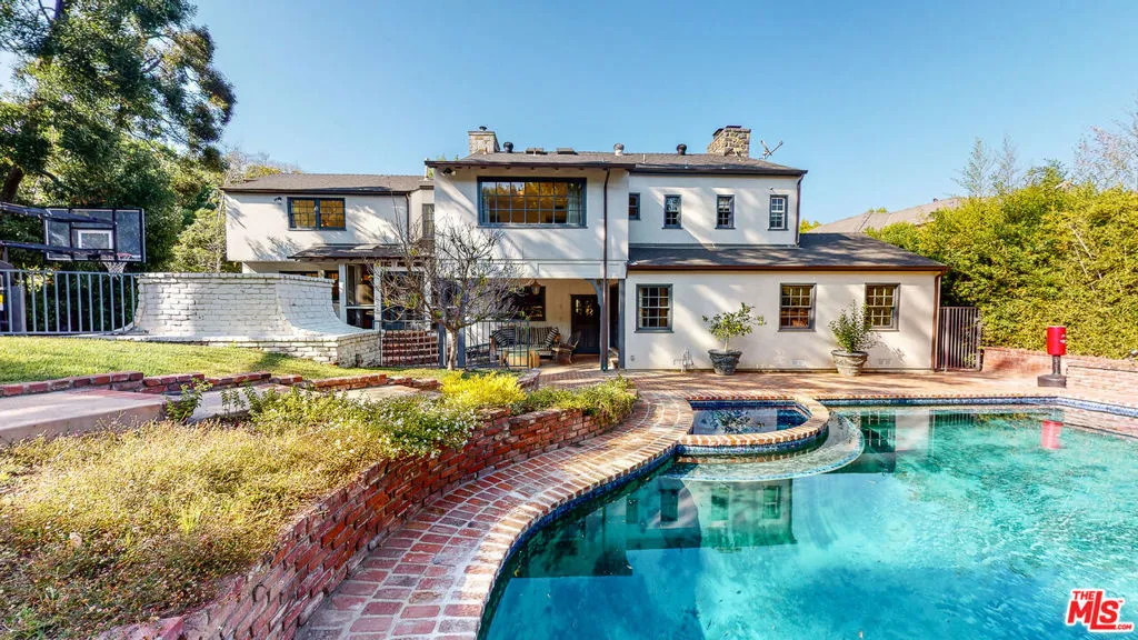 East Coast traditional meets Old Hollywood glamour on one of the most beautiful streets in Little Holmby. This elegant and character-rich residence blends preserved architectural charm with the scale and amenities of modern living. The main level features a gracious living room with decorative fireplace and abundant natural light, opening to an oversized family room/sunroom with a second decorative fireplace, built-in window benches, and French doors leading to a covered brick patio. A separate office/playroom with French doors provides flexible additional living space. The formal dining room showcases a built-in china cabinet and opens to a charming screened porch overlooking the rear yard, ideal for breezy afternoons and indoor-outdoor entertaining. The expansive chef's kitchen is exceptionally well equipped with an oversized Viking gas range, commercial hood, oversized stainless refrigerator, wine refrigerator, and an additional under-counter refrigerator in the large island. A farmhouse sink framed by corner windows with treetop views, spacious breakfast area, abundant windows, and direct access to the screened rear porch complete the space. A guest/maid's suite is located just off the kitchen with bedroom, closet, and full bathroom, and a convenient powder room sits near the foyer. Upstairs, the elegant primary suite features a decorative fireplace, spa-style bath, and two walk-in closets. A second bedroom offers an en-suite bath, while two additional bedrooms with cathedral ceilings share a third bathroom. The level also includes a hallway laundry closet and a useful office nook. The lower level provides a second laundry room and extensive storage. The south-facing backyard is designed for entertaining and recreation, featuring a saltwater pool, brick patio with built-in barbecue, grassy yard, and a separate pool house/guest house with cathedral-beamed ceilings, full bath, storage, and game room potential. A concrete sport pad with basketball hoop adds additional outdoor space. Additional features include a 2-car garage with EV charger, driveway parking, newly refinished hardwood floors throughout, and numerous charming architectural details throughout the home. Gardener, pool service, and security system included. Long-term lease welcome. All fireplaces are decorative only. Photos are virtually staged.