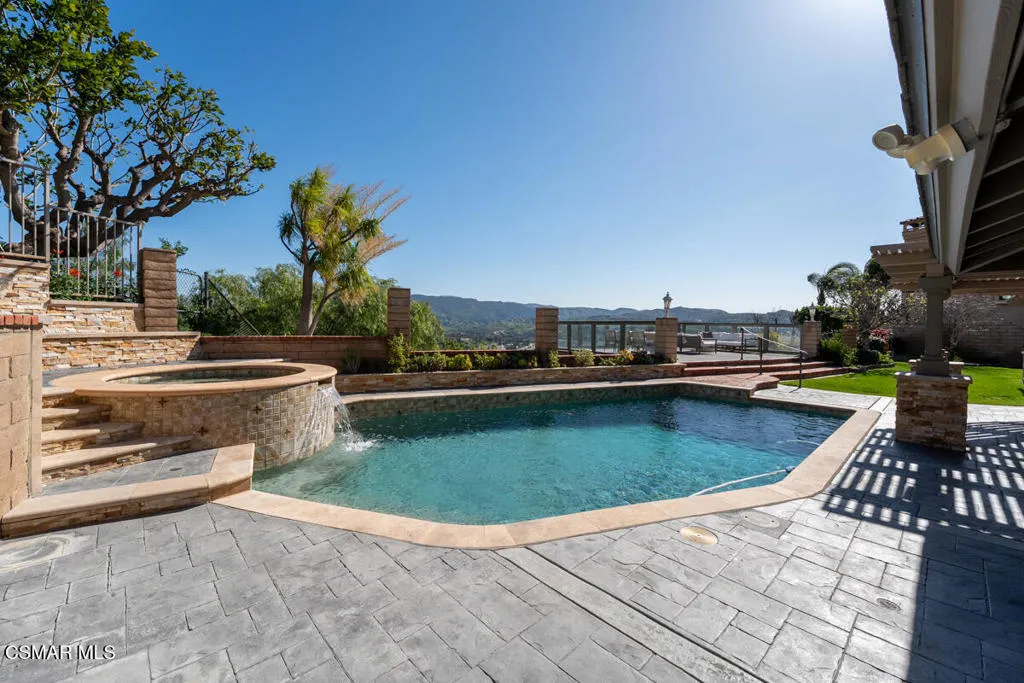 SPECTACULAR TURNKEY VIEW HOME in the desirable Hidden Hills Estates neighborhood has everything you could ask for in luxury living! The main floor includes a formal living room with a fireplace and built-in shelving and a dining room that leads to an upgraded kitchen with some newer appliances, a cozy breakfast bar and a desk area. The kitchen also opens to a family room and both overlook a huge play and entertaining area with its gorgeous PebbleTec pool, spa and waterfall and a deck that offers mountain and canyon views and is ideal for lounging, eating and entertaining. The kitchen pass through to the outside bar just adds to the feeling of an entertainer's dream. Back inside, the dramatic entry way takes you to a regal spiral staircase that leads to the second floor where you'll find a luxurious primary suite with multiple sitting areas, a fireplace, built-in bookshelves and a balcony that gives immediate access to those gorgeous views. The large primary bathroom features a stand alone bathtub, gorgeous shower and two sinks. A private wing with two bedrooms and a bathroom rounds out the top floor living quarters. There are also two full bedrooms and two full bathrooms downstairs as well as a laundry room. Mature apple, lemon and orange trees line the backyard. Additional features include luxury vinyl plank flooring throughout the bottom floor, new carpet and new interior paint and a three-car garage with its epoxy flooring. Excellent schools, convenient to shopping.