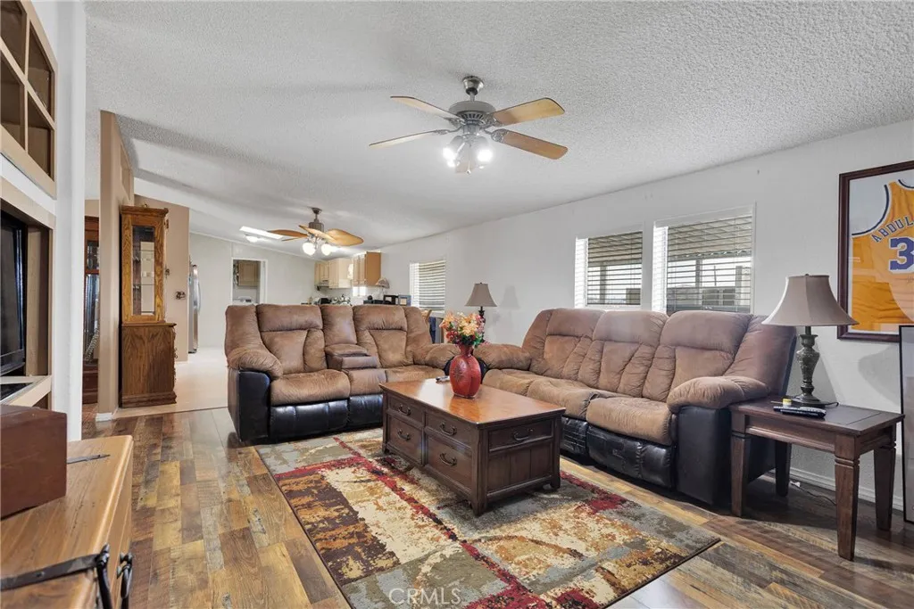Charming 4-bedroom, 2-bathroom Mobile Home on Permanent Foundation with Modern Updates! This spacious 2002 mobile home is set upon perm foundation with a 2-car detached garage. This property offers an ideal blend of comfortable living and convenience. Split floor plan, large primary suite, with TV area or office, with en suite bathroom and walk in closet. 2 additional bedrooms have wardrobe closets. Ample storage with 2 extra sheds, free standing spa with privacy screening, built in BBQ, and covered patio make a perfect area for entertaining. Large kitchen with center island and a separate room for laundry, washer, and dryer. Even a freezer will fit in there. Recent upgrades include newer flooring in the living room, family room, hall, and one bedroom. Brand new roof was installed in 2024, giving you peace of mind for years to come. Could be horse property, fence does not include the entire property, section in back could be for barn and arena.