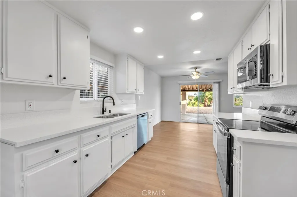 Welcome to 28320 Oregon Place, a beautifully refreshed single-story home tucked into an established Menifee neighborhood. This move-in-ready property offers a bright, open layout with thoughtful updates throughout, a perfect for comfortable everyday living and easy entertaining. Inside, you’ll find fresh interior finishes, recessed lighting, and newer wood-look flooring that flows seamlessly through the main living spaces. The updated kitchen features crisp white cabinetry, quartz-style countertops, stainless steel appliances, and a modern black faucet, opening effortlessly to the dining area and living room for a spacious, connected feel. Large windows and sliding glass doors fill the home with natural light. The living room offers generous space with a cozy fireplace, while ceiling fans throughout enhance comfort year-round. Bedrooms are well-sized, and the layout is both functional and inviting. Step outside to a low-maintenance backyard with fresh gravel landscaping, a covered patio with pergola, and a detached storage shed—ideal for relaxing, entertaining, or creating your own outdoor retreat. The private yard offers plenty of usable space without the upkeep. Conveniently located near shopping, dining, schools, and commuter routes, this home checks all the boxes for buyers looking for.
