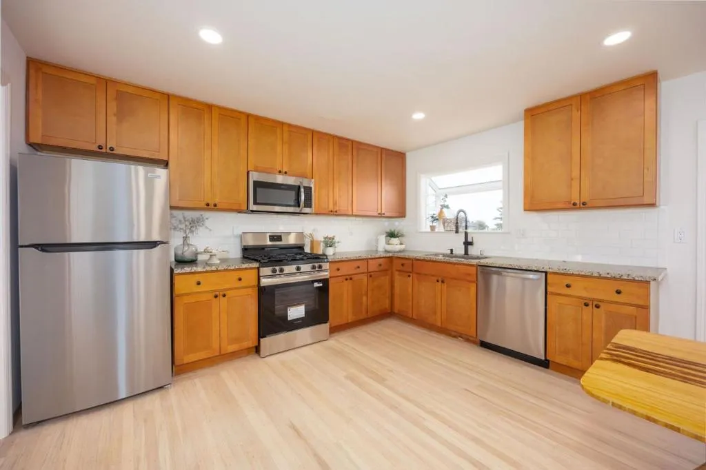 Discover coastal living in this beautifully updated single-story rancher in Lower El Granada. Thoughtfully refreshed throughout, the home features four comfortable bedrooms, refinished hardwood floors, recessed lighting, and a welcoming living room with a fireplace. The kitchen offers brand-new stainless steel Frigidaire appliances including a gas range, along with maple cabinetry and granite countertops. The hall bathroom includes a tub/shower, while the primary bathroom has been fully remodeled with floor-to-ceiling tile and a new shower stall with modern fixtures. A spacious garage plus additional carport parking provide excellent functionality. The backyard enjoys peaceful green-space views with no rear neighbors, backing up to open land. Ideally located moments from the Coastal Trail, Pillar Point Harbor, Surfers Beach, local restaurants, shops, cafés, and scenic hiking trails, coastal convenience and comfort come together in this El Granada gem.