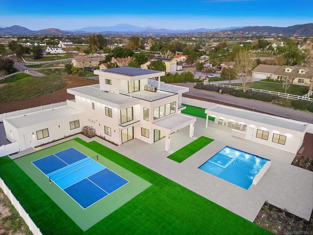 The most modern, sophisticated, and luxurious home in Temecula Wine Country. This opulent Ibiza-style villa was designed after the award-winning Villa Fabulosa—selected by Expedia and VRBO as the top vacation rentals in the U.S. The brand-new 5,000 SF home features 5 spacious bedrooms, 5.5 baths, a professional theater room, an expansive gourmet kitchen with a vast pantry, a magnificent walk-in closet, a 4-car garage with glass doors, two balconies, and two roof decks with breathtaking 360-degree views. Includes exquisite modern finishes, a soaring 22-ft family room with a dramatic fireplace, a 20-ft sliding glass door blending indoor/outdoor living, and the most gorgeous sunsets! Resort-style amenities include a pro-sized pickleball court, putting green, large pool & spa, sports area, and more, surrounded by over 55 world-class wineries. Includes a 750 SF outdoor kitchen with everything you can imagine. Plus a large bonus room. It includes a large flat pad perfect for horse stables, tennis courts, a warehouse, etc. The 1,300 guest house includes 3 br, 2 ba, and about 30,000 sf of flat pad, which is perfect for a caretaker, a brand-new 2,500 SF home with a 360-degree view, or rental income. This home has been generating $3,500/month in rent. At 4% cap rate, this asset alone adds over $1,050,000 in value. Income-Producing Opportunities: The guest home generates $3,500/month in rental income, which at a 4% cap rate equals over $1,050,000 in value. The new residence may qualify as a Cottage Inn, offering the potential to create a high-income-producing asset.