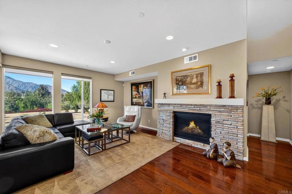 Panoramic views of the San Jacinto Mountains, among the best in the valley. This modern masterpiece, on the 18th hole at Escena, is finally available. A tranquil water feature, walking paths and biking trails are all included—an exceptional setting not to be missed. An optional third bedroom upstairs is currently used as a media room and features its own balcony. Additional highlights include a built-in office area, a spacious media center room, a large rear patio with a gas grill, a spacious living room with gas fireplace, an adjacent formal dining room and a breakfast nook in the kitchen. Majestic mountain and golf course views can be enjoyed from every west-facing door and window. Solar provides low cost energy and the 220 car charger in the garage is an added bonus. The Escena community offers a rare blend of scenery, style, location, and accessibility. Escena Golf Club and the Escena Grill are just a short walk away via the golf path from the residence. Open to the public, the Escena Grill and Golf Course are among Palm Springs most popular destinations for relaxation, sweeping views, and outstanding dining. Featuring a Nicklaus-designed championship golf course and an iconic Mid-Century Modern clubhouse, this home listing represents one of the finest opportunities currently available in Palm Springs.
