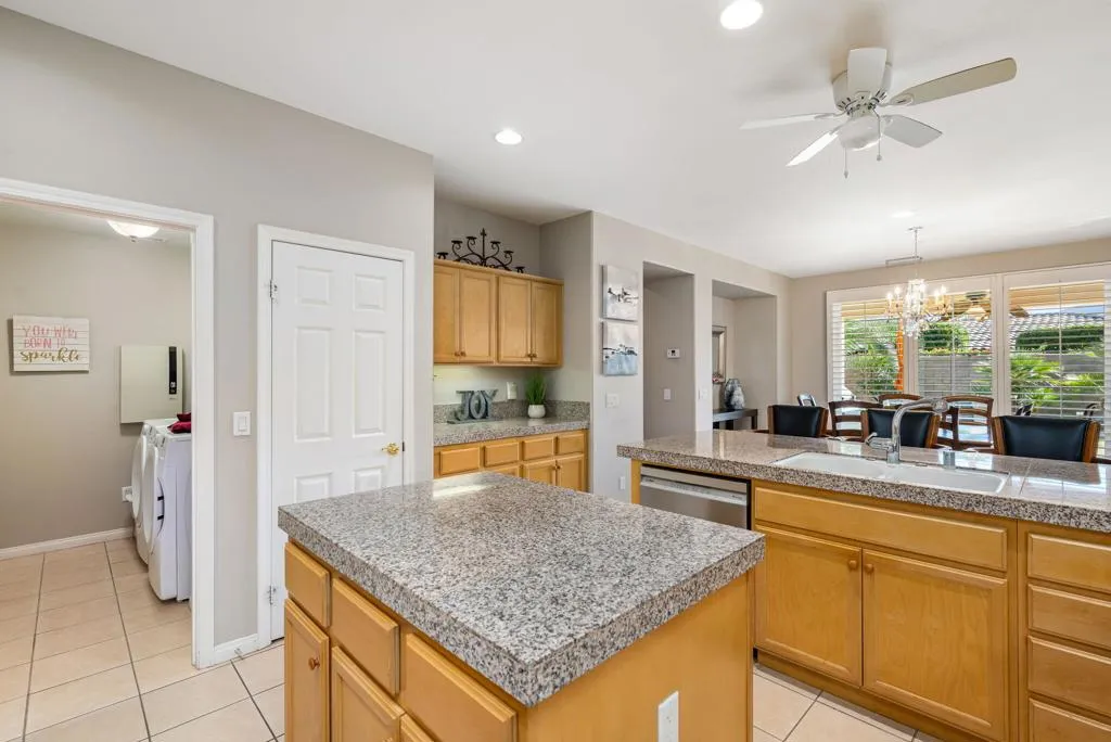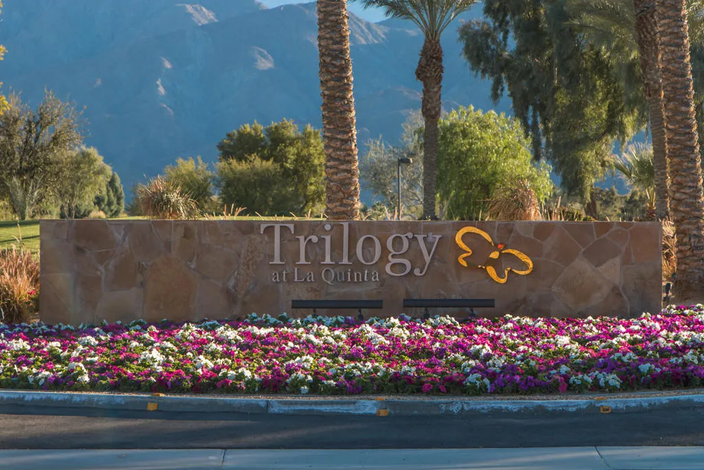 Tucked behind the exclusive gates of Trilogy La Quinta, this impeccably maintained Oasis plan delivers resort‑style living in the heart of the Coachella Valley. Offering 1,580 square feet of airy, open‑concept design, the home features 2 bedrooms and 2 baths, introduced by a charming wrought‑iron entry that leads into a light‑filled great room with media niche, elegant downlighting, plantation shutters, and sweeping views of the lush rear yard. The adjacent chef's kitchen shines with slab countertops, stainless steel appliances, prep island, breakfast bar seating, gas range, built‑in microwave, and a generous pantry. The primary suite is a serene retreat with a bay window, patio access, and spa‑inspired bath boasting dual vanities, marble surfaces, and a comfortable shower. A well‑separated guest suite ensures privacy for visitors. Step outside to your own desert sanctuary complete with a professionally installed putting green, low‑maintenance landscaping, extended covered patio, and a relaxing above‑ground spa--all just moments from the Santa Rosa Clubhouse and world‑class community amenities.