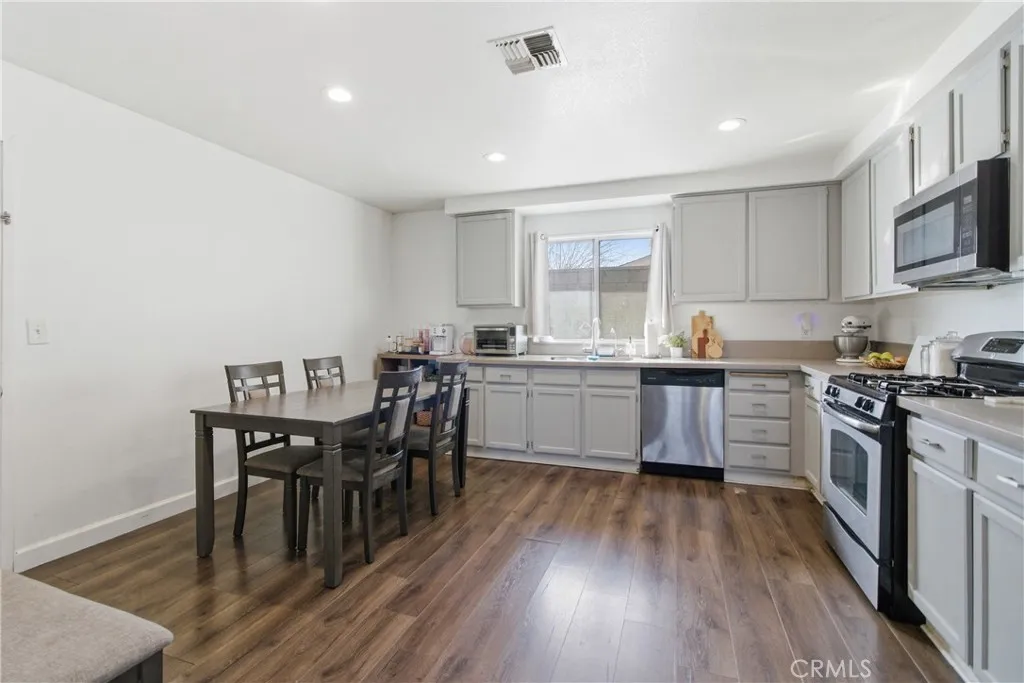 Welcome to this beautifully refreshed single-story home featuring a charming covered front porch with arched details and a spacious front yard. Step inside to discover an inviting living area with vinyl plank flooring, a cozy brick fireplace, and abundant natural light. The updated kitchen offers modern cabinetry, stainless steel appliances, and generous counter space, making it ideal for both everyday living and entertaining. The adjacent dining area provides a comfortable space for gatherings. The bathroom showcases quartz-style countertops, updated fixtures, and a shower/tub combination. Neutral interior paint, updated flooring throughout, and thoughtful finishes give the home a clean, move-in-ready feel. Outside, enjoy a fully usable yard, side-yard access, and plenty of space to customize for entertaining, gardening, or future improvements. A wide driveway and attached garage provide convenient parking. Enjoy open desert surroundings and distant hill views in a quiet neighborhood, with easy access to schools, shopping, and major commuter routes.
