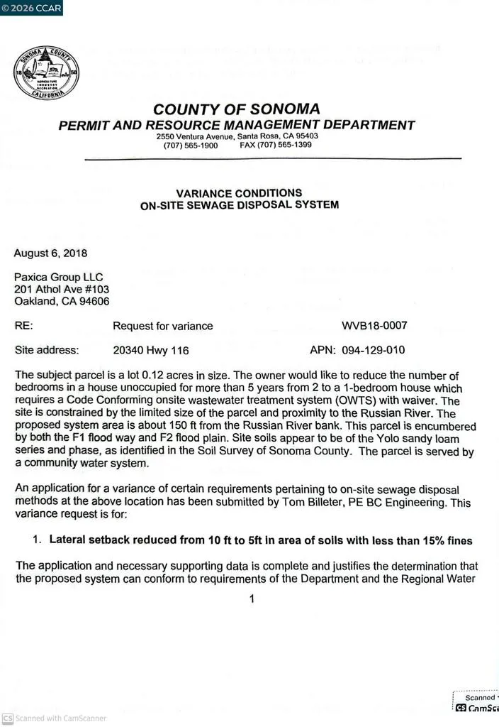 In a Flood and fire zone Needs all new plumbing, electrical and septic tank All permits are through the county of Sonoma The interior unit is stripped to studs. Roof had around 25 years left on life Property is sold as is, great opportunity for a seasoned or investor or for a first time flip.