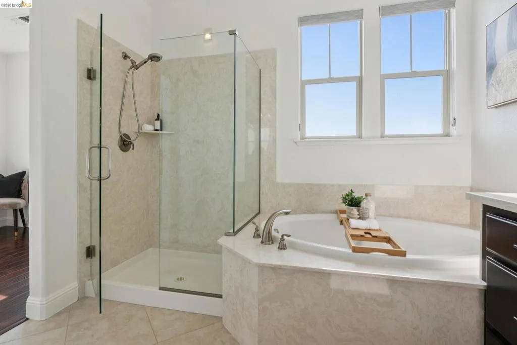 Stunning contemporary townhome with panoramic San Francisco Bay views, located in the desirable Monte Vista Villas community in Oakland Hills. Built in 2013, this 4-bedroom, 3-bath residence offers an open floor plan filled with natural light and hardwood floors. The main level features an open living and dining area that opens to a view balcony, along with a chef’s kitchen equipped with stainless steel appliances, granite countertops, a large center island, ample storage, and access to a private rear patio ideal for entertaining. A full bedroom and bathroom on this level provide excellent flexibility. Upstairs, the spacious primary suite enjoys bay views and a spa-style bathroom with dual vanity and soaking tub, accompanied by two additional bedrooms, a full bath, and a laundry room. Additional upgrades include an owned 3.4 kW solar system, EV charger, hot water recirculation system, reverse osmosis drinking water filtration, home security system with outdoor cameras, automated Stoneside blinds, and an automated garage with MyQ monitoring. An oversized attached two-car garage offers direct interior access. Community amenities include a clubhouse, fitness center, walking paths, and playgrounds. Easy access to highway 580, 13 and 24.