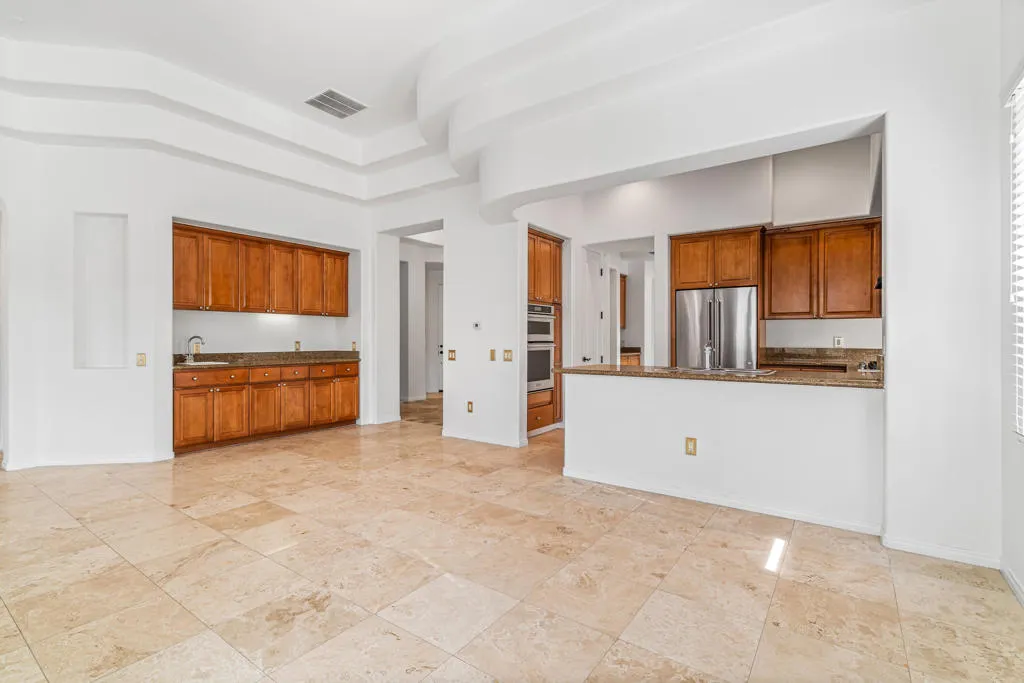 Welcome to Villa Portofino, a premier 55+ community in the heart of Palm Desert. This desirable Siena floor plan offers two bedrooms, two bathrooms, a den, living and dining rooms, fireplace, wet bar, and a wrap around patio. The home includes an attached two-car garage plus space for a golf cart.Elegant details include tray ceilings in the entry foyer, living room, and dining room; custom solid maple cabinetry throughout; and eight-foot Italian-design solid core interior doors. Travertine stone flooring highlights the entry, hallways, kitchen, dining room, bathrooms, and laundry room, with brand-new carpet recently installed in all remaining living areas.European-finished interior and exterior walls, custom stone accents, and classic Old World clay tile roofing enhance the home's timeless appeal. Eight-foot French doors and windows feature aluminum-clad exteriors, and energy-efficient Low-E insulated glass designed for desert living. Spa-inspired bathrooms showcase imported stone surrounds, including a primary bath with separate tub and walk-in shower.Additional features include R-38 ceiling insulation and insulated exterior, interior, and garage walls for enhanced temperature and sound control.Villa Portofino residents enjoy a 30,000-square-foot clubhouse with five-star resort amenities, including concierge services, movie theater, fitness center, bistro, pool, yoga studio, library, card and meeting rooms, and more. Ideally located near Eisenhower Medical Center, El Paseo shopping and dining, The McCallum Theatre, Whole Foods, Bristol Farms, and world-class restaurants.