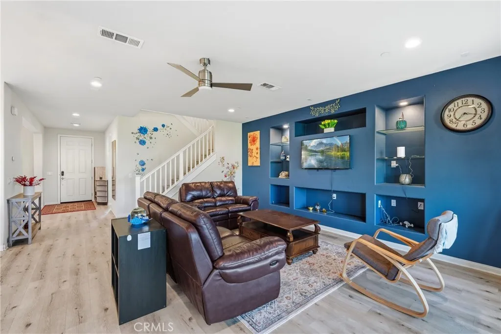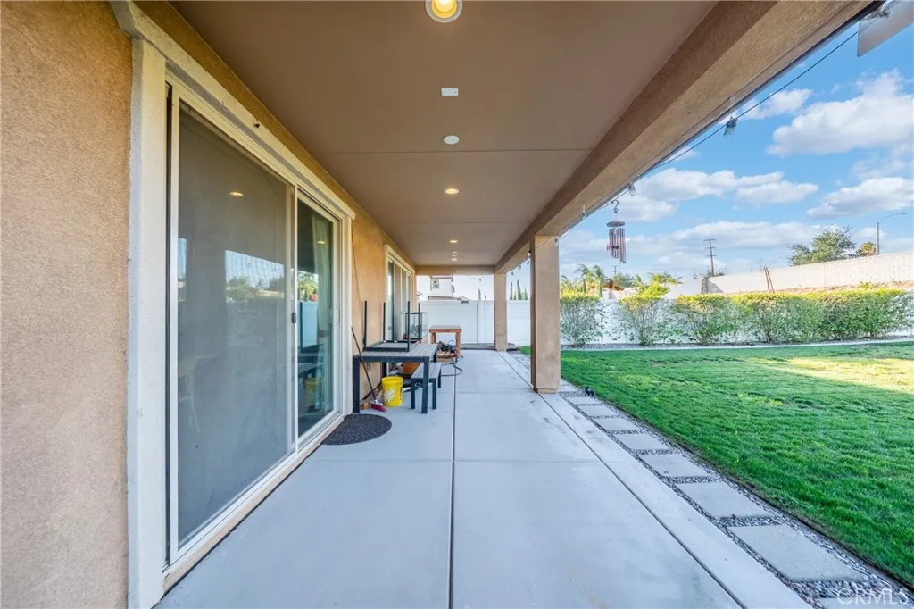 Outdoor features include a California-style patio pre-wired for ceiling fans and a fully landscaped rear yard, ideal for everyday enjoyment and entertaining. A 12-foot sliding glass door creates a seamless indoor–outdoor connection. The front yard is designed with low-maintenance artificial turf, reducing ongoing upkeep.