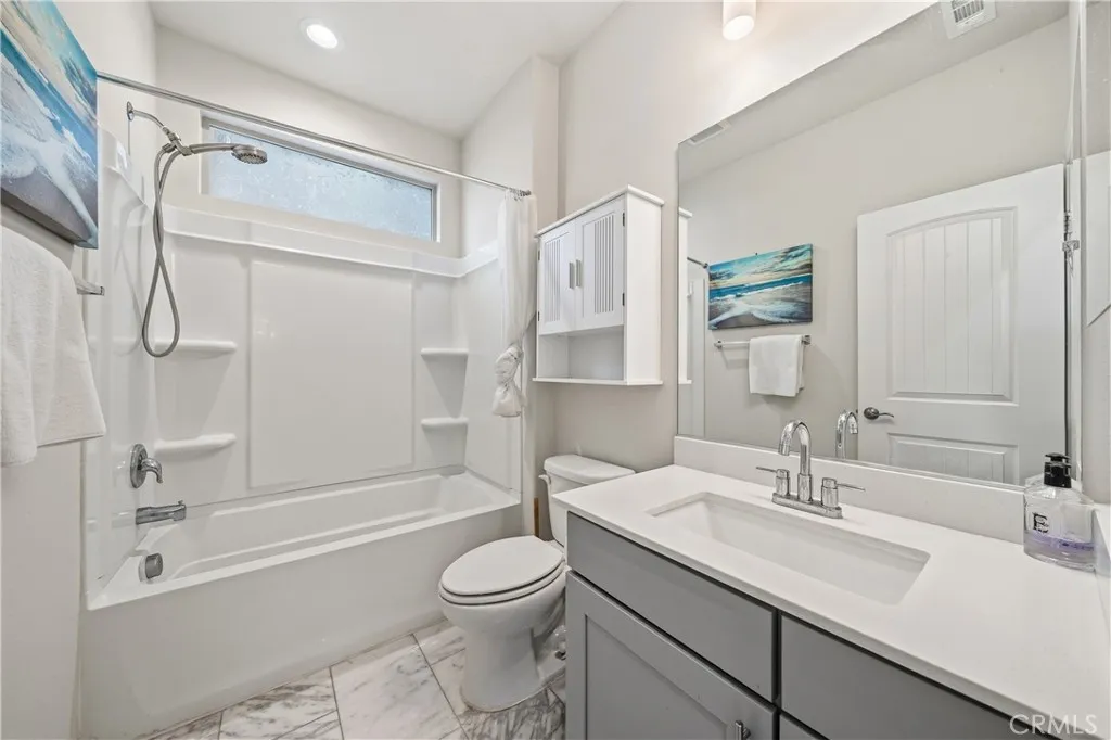 Bathrooms and the laundry room are finished with marble flooring, while the primary bathroom features a full quartz shower and Carrara marble–style quartz countertops, offering a refined and durable finish.