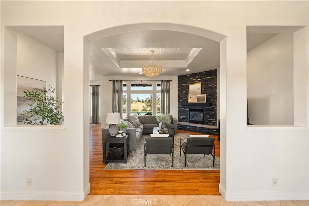 The interior is thoughtfully designed and filled with natural light, featuring travertine and wood flooring throughout the main living areas, graceful arched doorways, soaring ceilings, and floor-to-ceiling windows that frame the scenery beyond. The spacious living room showcases a striking fireplace and custom tray ceilings and flows seamlessly into the well-appointed kitchen, complete with granite countertops, bar-top seating, newer appliances, and rich knotty alder cabinetry. Adjacent dining space overlooks the pool, creating an ideal backdrop for gatherings and entertaining.