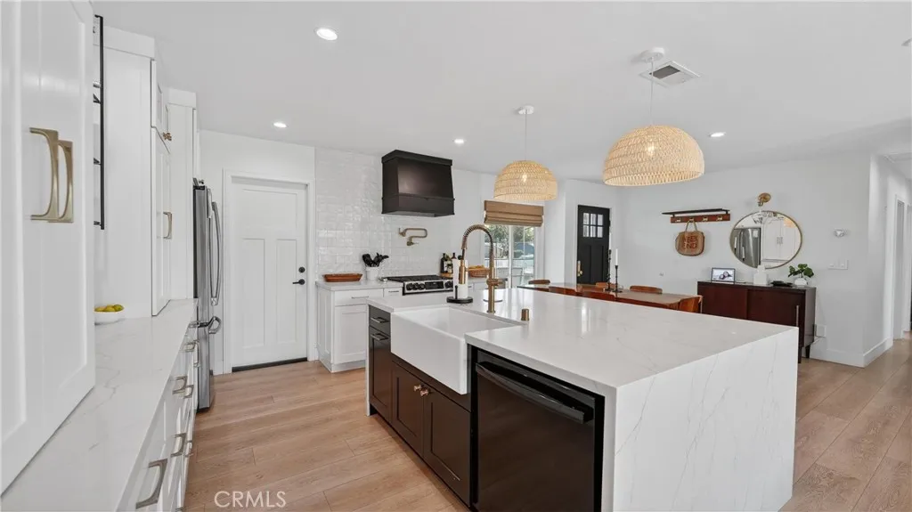 An original Lake Forest home with a completely remodeled interior and exterior. No expense was spared in 2020 when local interior designer, Makkan Design, turned an old home into a modern, timeless ranch. A house built to last and ready to host many family events. New modern amenities include water softener, plumbing, Tesla charger, wi-fi garage door, solar, and Nest thermostat. As you walk in, you'll immediately notice the 7' island with double waterfall quartz countertops and wide LVP floors. A tiled pearl backsplash covers the entire wall above the stove only to be broken up by a pot filler and a custom range hood that matches the decor perfectly. Custom glass shelves hand made in the USA hang on the center wall of the kitchen to give you an all around feel of luxury. Solid wood Innocraft cabinets created for function and used for all your cooking/storage needs. An appliance garage hiding your coffee, microwave, and toaster. An open style living room with an original wood burning fireplace is brought back to life with modern Cle tile that creates a centerpiece. Tons of natural light shine through the 16' sliding glass doors which lead you straight to the dream backyard. Black out curtains for when you want to watch a movie or take a nap. Beautiful hydrangea wallpaper in the hall bath surrounded by subway tiles and matching tile floors. A large tub with shower hose for elegance and extra cleaning. Each bedroom is equipped with custom closets and sliding doors for full access. Primary bath adorned with marble flooring and shower wall. Full glass door with no step for seamless access and tranquility. All finishings are Kohler with a lifetime warranty and all rooms include black out roman shades for sleeping in. The corner lot provides ample space for front and backyard activities. A full BBQ kitchen and firepit connected to gas lines, no propane needed! Pergola for shade and outdoor dining.