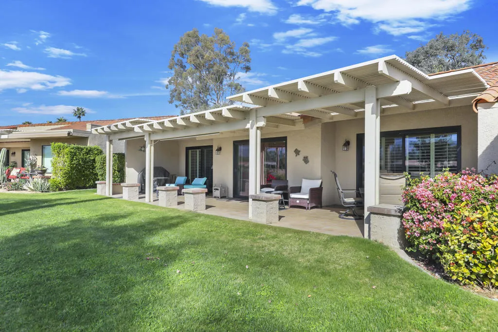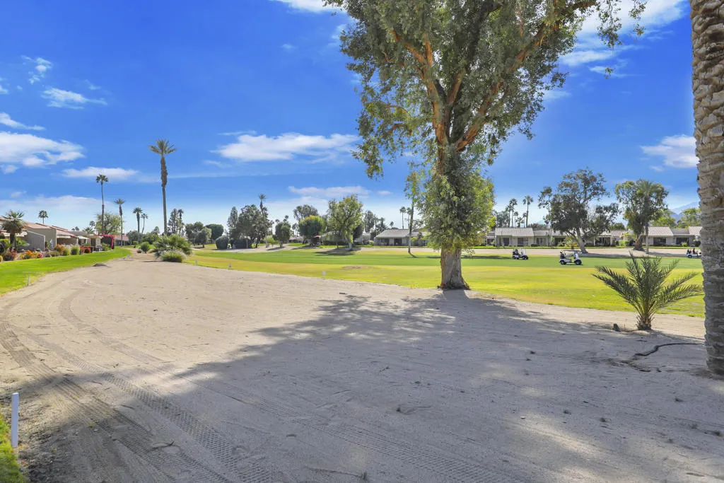 PRICED TO SELL! Offered furnished including golf cart, this beautifully upgraded condo is perfectly positioned on the 14th hole with sweeping lake views and dramatic south-facing mountain scenery. Sunlight pours into the open living spaces, enhanced by diagonally laid tile flooring, recessed lighting, crown molding, and oversized baseboards throughout. The redesigned kitchen has been opened to the living area and showcases granite countertops, a generous island with breakfast bar seating, flat-panel cabinetry with pull-out shelving, and soffit-style recessed lighting--ideal for both everyday living and entertaining. Plantation shutters grace nearly every window. The primary retreat features direct patio access, a large multi-section walk-in closet, and a spa-inspired bath with upgraded cabinetry, granite counters, and a striking tile and glass-block walk-in shower with glass enclosure. Guests enjoy exceptional privacy with a bedroom located on the opposite side of the condo, complete with a Murphy bed, walk-in closet, patio access, and a fully remodeled bath with granite counters and walk-in shower. A dedicated indoor laundry room has been thoughtfully relocated inside the residence for added convenience. Outdoor living shines on the expansive rear patio with multiple seating areas and an Alumawood cover--perfect for relaxing, dining, and soaking in the tranquil lake and mountain views. Attached two-car garage includes built-in cabinetry and excellent storage. A rare opportunity to own a turnkey, view-oriented home that delivers comfort, style, and effortless desert living. Located in the Palm Desert Resorter, where short term rentals are allowed, 18 hole golf course, 2 Bocce ball courts Tennis and Pickleball, 20 pools and spas. Very active clubhouse with bar and restaurant Guard gated community.