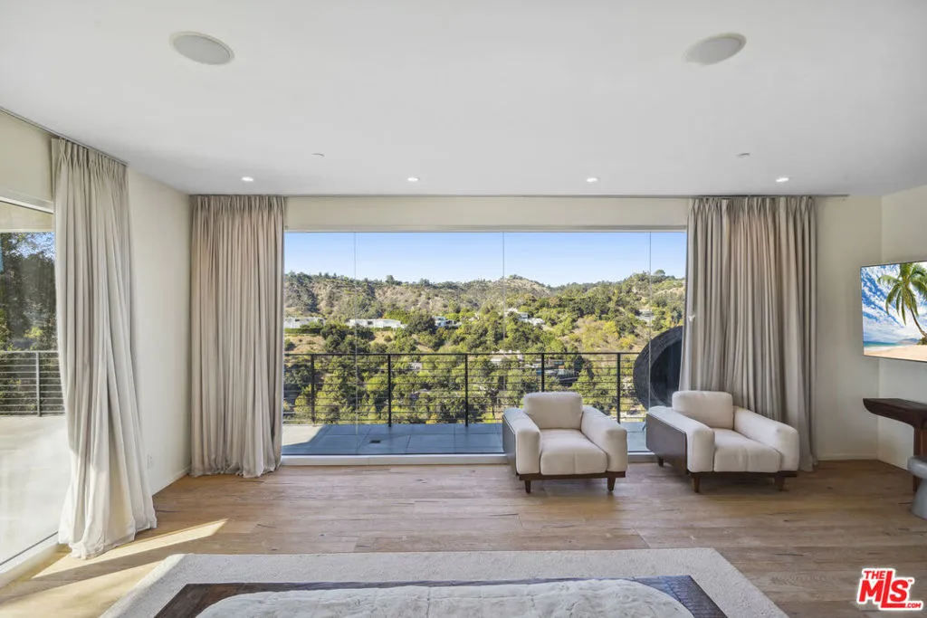 Suspended above the city within one of Beverly Hills' most exclusive, celebrity-favored gated enclaves, 9716 Oak Pass Road is a striking contemporary estate offering exceptional privacy, architectural distinction, and breathtaking panoramic views. The community is gated, and the residence itself is further secured behind its own private gate and drive, creating a rare and dramatic sense of arrival. Spanning approximately 6,244 square feet across three dramatic levels, this modern sanctuary is wrapped in walls of glass that capture canyon vistas from nearly every room, delivering a seamless indoor-outdoor lifestyle throughout. A signature architectural highlight is the glass-enclosed skybridge hallway suspended above the infinity-edge pool, serving as a sculptural centerpiece on the main level and elevating the home to true statement-level design. The residence offers a total of four bedrooms, including an expansive and private primary suite retreat with commanding views, oversized walk-in closets, and a spa-inspired bath. Three additional guest bedroom suites provide exceptional comfort and privacy. Designed for both refined daily living and elevated entertaining, the home features a gourmet chef's kitchen, sophisticated formal and informal living areas, a private executive office anchored by a dual-sided fireplace, and a dedicated private theatre/media room. Multiple view terraces and decks extend the living experience outdoors, while the floating infinity-edge pool appears to merge with the skyline, creating a resort-style setting high above Beverly Hills. Set among notable neighbors within an elite and discreet hillside enclave, this exceptional contemporary residence delivers a rare combination of privacy, prestige, and iconic architecture on one of Beverly Hills' most coveted streets.
