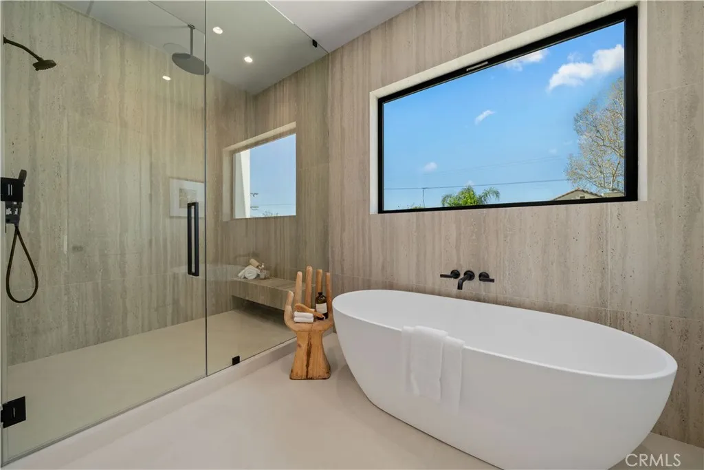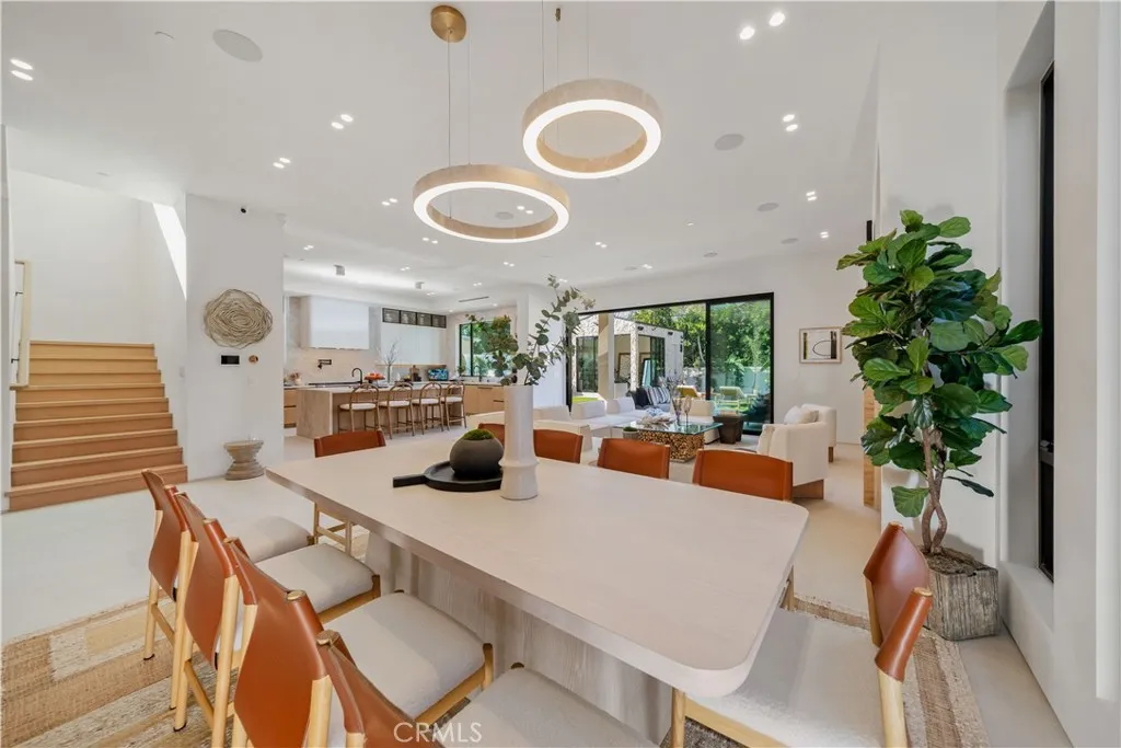 Stunning, new transitional home in prime Sherman Oaks! Featuring home and detached rec room with 5 BR – 6.5 BA in approx. 3,600sqft on an over 7,000sqft gated lot. Gourmet kitchen with custom white oak cabinetry, stainless-steel appliances, center island with bar seating, and Taj Mahal quartzite counters/backsplash. Kitchen opens to adjacent dining room with custom built-ins and accent lighting, and a spacious family room with fireplace, travertine mantle, and sliding doors to tiled patio with trellis covering. Spacious backyard features patio area, BBQ area with bar seating, turfed lounge area, rec room with ¾ bath, and salt water pool/spa with pebble finish. Spacious primary suite features pitched ceiling with beam design, electric fireplace, large walk-in closet, balcony, and primary bath with porcelain/travertine tilework and soaking tub with picture window. Home is completed by entertainer/designer details such as custom stonework and woodwork, pavestones, limewash wall finishes, landscape lighting, Control 4 smart home system, surround sound speakers, central vacuum system, and security system with alarm/cameras.