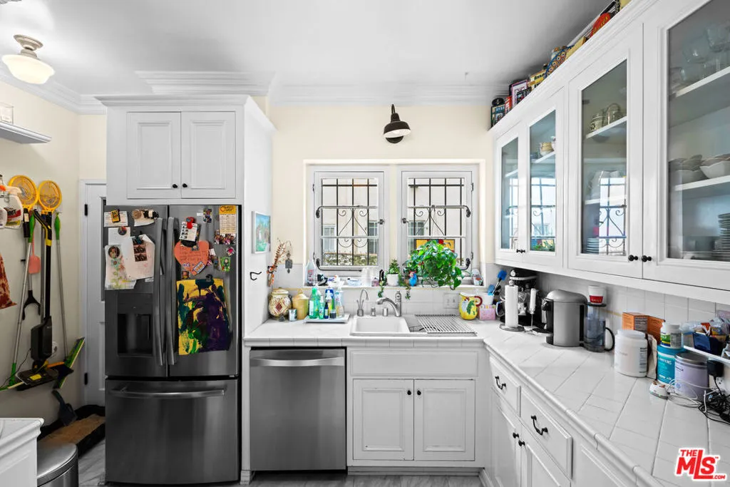 This amazing French Normandy fourplex offers timeless architectural elegance and impeccable pride of ownership within the South Carthay Historic District (HPOZ). The building features a prime mix of (2) 2BD/2BA and (2) 1BD/1BA units, each offering rich character touches such as gleaming hardwood floors, exquisite crown molding, stained-glass windows, and old-world chandeliers. Every residence boasts a grand living room with an elegant decorative fireplace, a formal dining room (which could double as a home office), and updated bathrooms with separate soaking tubs and walk-in showers. All but one of the kitchens have been tastefully remodeled to blend seamlessly with the historic charm. Residents enjoy use of a private backyard patio with fruit trees, there is a detached garage with one assigned parking space per unit, and it has a California basement where the W/H and Central A/C and heating system are housed. Oil royalty income is transferrable and included in the sale. The owner's 2BD unit has 1340 sq. ft. and will be delivered VACANT at COE, making it a rare opportunity for an owner-user or a high-end rental. A truly special offering in one of LA's most coveted and tranquil neighborhoods.