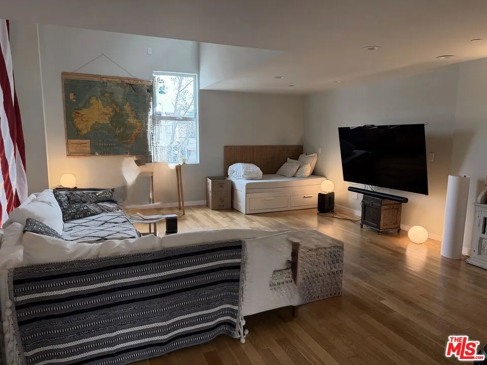 Inviting live/work/loft in the heart of Santa Monica, close to the beach, markets & great restaurants. One of a kind open & airy space with very high ceilings, tons of light with many skylights and operable windows. Large SW facing, sunny balcony with beautiful ocean breezes to enjoy your morning coffee. This wonderful unit is only one of 2 live-in units in the building. Just one common wall with a Barber shop down below, open business hours only. 1 covered parking, high speed internet available, washer/dryer hook ups & awesome air purifiers. Private entrance to a great open kitchen & spacious living room. Upstairs could be a lovely bedroom with options, plus an atrium room with double pane windows making for good private space. Use this unit as an artist loft, live/work space, business or to simply live comfortably.