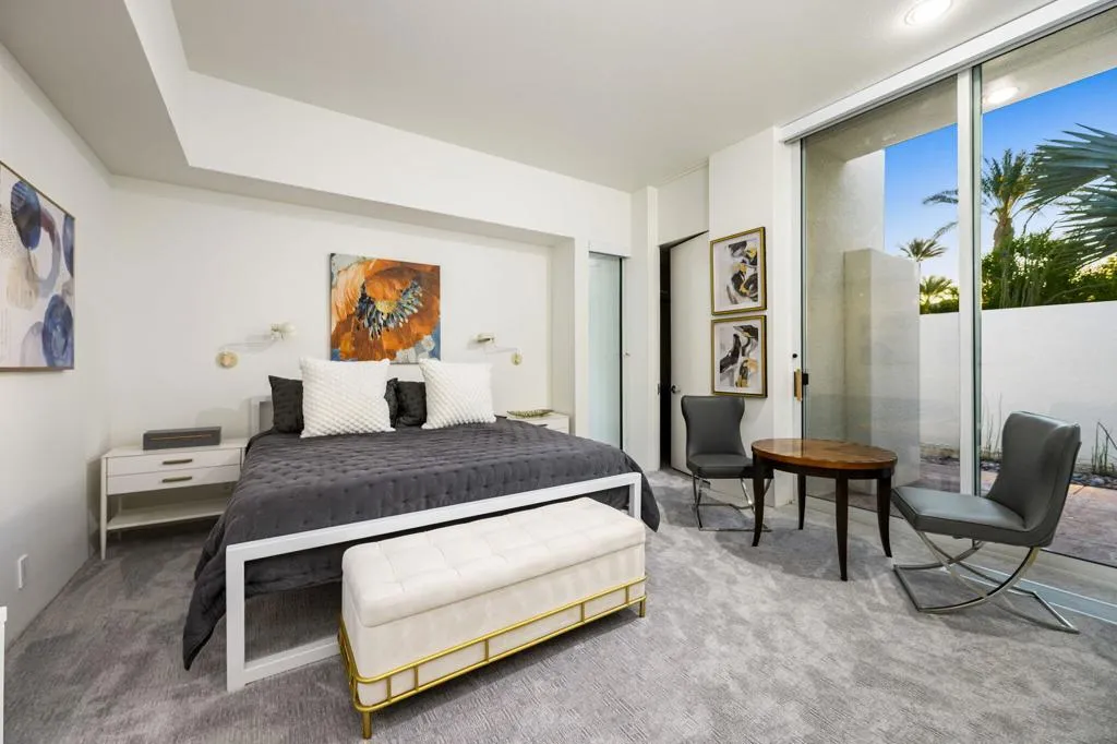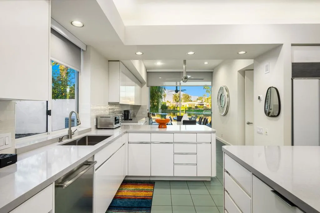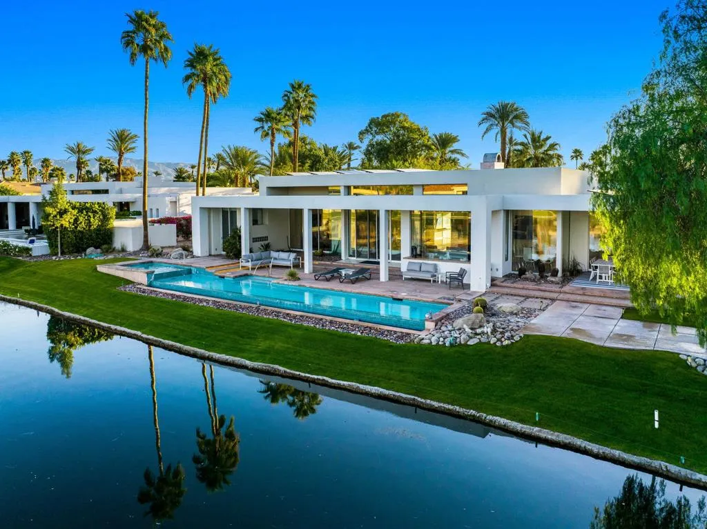 Custom Contemporary with Stunning Architecture by Holden and Johnson, Premier Location in Fairway Estates with Spectacular Lakefront and Southwest Mountain Views. Enter through a circular driveway to gated courtyard with custom desert landscaping and double glass door entry. Bespoke finishing with stone tile flooring, wood ceilings, granite accents and walls of glass. Open Great Room features a double sided fireplace separating spaces for living and dining as well as a custom dining buffet and an entertainers bar with those stunning views. Updated Open Kitchen and Morning Room are light and bright with white cabinetry, quartz countertops and island, Subzero Refrigerator and newer Thermador stainless appliances all overlooking the lake and mountain views. Media Room/Den off of Great Room provides a great space for movie nights or an office. Primary Bedroom suite includes stunning views overlooking the pool terrace, lake and mountains,, Updated Spa Bathroom with Dual Vanities, toilets and walk-in closets as well as beautiful tiled shower and spa bath. A gym/ office overlooking the lake could serve as an overflow 4th bedroom. A separate wing of the house features a stunning architectural hallway leading to 2 guest suites, each with ensuite bath, walk-in closet and a patio for guests to enjoy desert outdoor living. Outside are multiple terraces including covered outdoor dining terrace with Built-in BBQ and Poolside and Lakeside Terraces as well as a swimmer's pool and spa. Solar Powered, Control 4 Smart Lighting System, Automatic Shades and 3 full car garage. Most furniture negotiable. It's all here for you to enjoy the desert lifestyle with taste and sophistication at a great price - oome home to your own desert retreat!