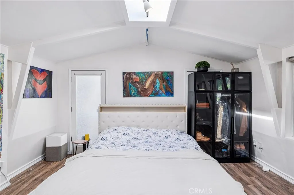 Proudly introducing this charming Bel Air bungalow—your own private hideaway nestled in the Beverly Glen Canyon area. This 2-bedroom, 1-bath residence offers 960 sq ft of thoughtfully designed living space on an expansive 5,590 sq ft lot, creating a rare blend of privacy and convenience. Upon entry, you’re welcomed by luxury vinyl plank flooring, track lighting, multiple skylights, and a cozy gas fireplace that anchors the open-concept living area. The kitchen seamlessly connects to the main living space and features butcher block countertops, stainless steel appliances, and a stylish fixed island—perfect for everyday living and entertaining. The secondary bedroom includes luxury vinyl plank flooring, track lighting, double-pane windows, and generous closet space. The modern bathroom is highlighted by a sleek tile shower, contemporary vanity, LED mirror, and skylight that fills the space with natural light. The spacious primary bedroom offers vaulted ceilings, multiple skylights, a walk-in closet with washer and dryer setup, and direct access to the backyard—ideal for indoor-outdoor living and future possibilities. This property features a secluded hillside terrace that provides beautiful nature and an expanded patio deck with a built out pergola and bamboo perimeter! Conveniently located just minutes from Beverly Hills, Century City, and UCLA-Westwood, this Bel Air retreat is also within the highly sought-after Warner Avenue School District. A rare opportunity to own a serene canyon escape with prime city access.