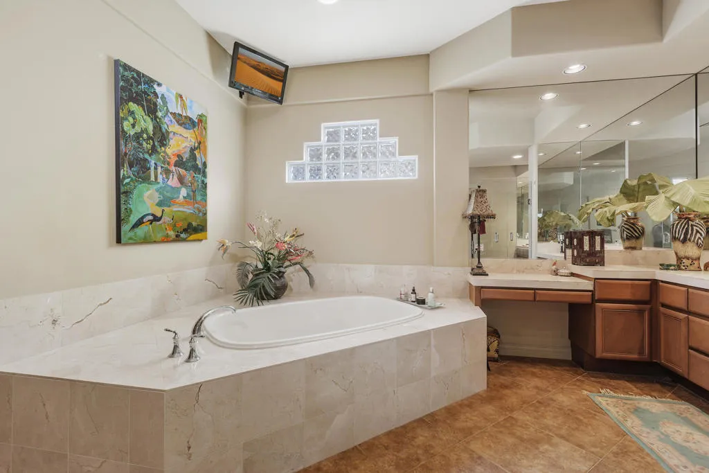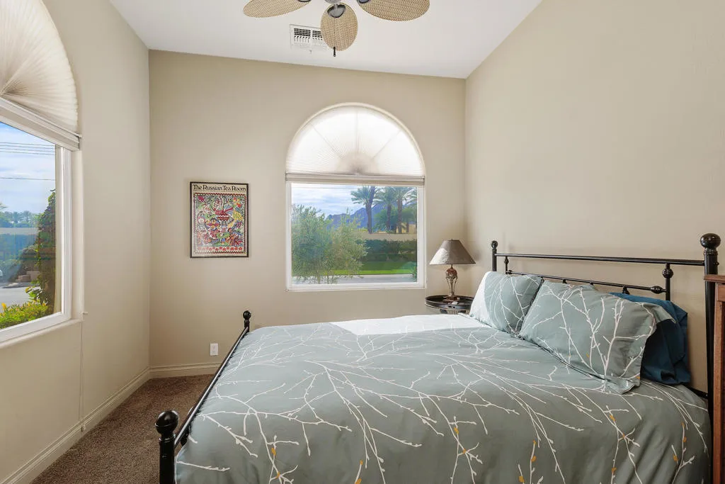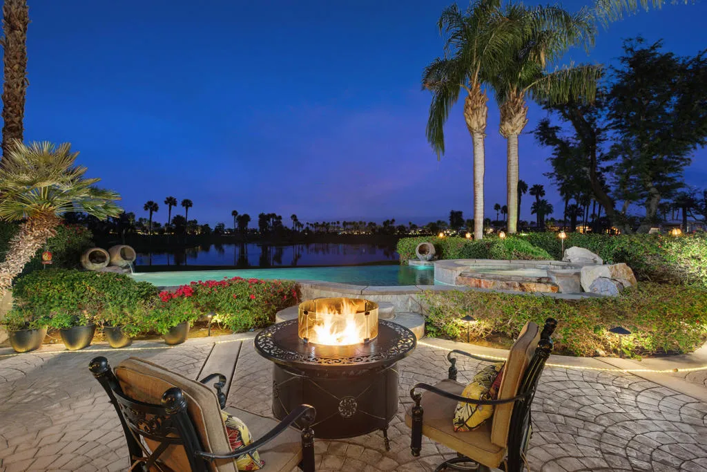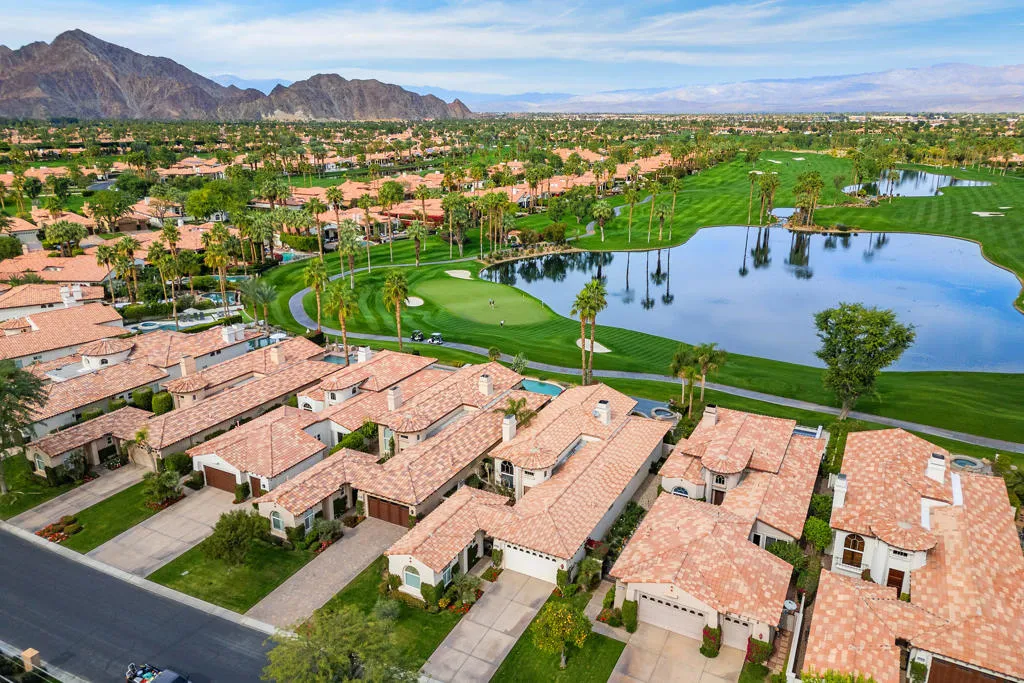 Perfectly positioned on one of the most coveted view lots in Rancho La Quinta Country Club, this exceptional Encanto II residence is situated to enjoy uninterrupted views of the golf course, lake, and surrounding mountains. Set against sweeping fairways and a shimmering lake, with panoramic mountain vistas, the setting is nothing short of breathtaking. Designed for seamless indoor-outdoor living, a dramatic infinity-edge pool appears to spill directly into the golf course landscape, creating a resort-style experience that feels both tranquil and expansive. A tanning shelf, built-in barbecue, outdoor dining area, fire pit, heaters, and thoughtfully arranged seating invite everything from quiet mornings overlooking the water to unforgettable evenings under the desert sky. Whether entertaining guests or enjoying a peaceful moment alone, this outdoor space delivers a sense of privacy, openness, and connection to the surroundings that is increasingly rare. Inside, the home is light-filled and welcoming, with soaring ceilings and a dramatic sightline that draws your eye straight through to the views beyond. The open living areas are ideal for entertaining, anchored by a warm fireplace in both the living room and family room and complemented by rich wood flooring and warm finishes throughout. The kitchen features a new gas cooktop, new dishwasher, new refrigerator, double ovens, a wine refrigerator, and generous island--perfect for casual gatherings or more formal occasions. The primary suite offers a calm retreat, complete with a spacious bath featuring dual vanities, soaking tub, and walk-in shower. Guest accommodations include a private detached casita with its own separate living space, bathroom, and kitchenette--ideal for visitors seeking comfort and independence. A gated entry courtyard features a gas fireplace and provides a private, welcoming outdoor retreat connecting the detached casita to the main residence. This home is sold furnished allowing a buyer to enjoy the home's lifestyle from day one. HOA dues provide 24-hour guard-gated security, high-speed internet, cable tv, landscape maintenance, and trash service. Also included is a sports membership offering access to the soon-to-be renovated clubhouse , tennis and pickleball courts, resort-style pools, and a state-of-the-art fitness center.With a premier location & iconic views, this is a rare opportunity to own a truly special desert retreat in one of La Quinta's most sought-after communities.