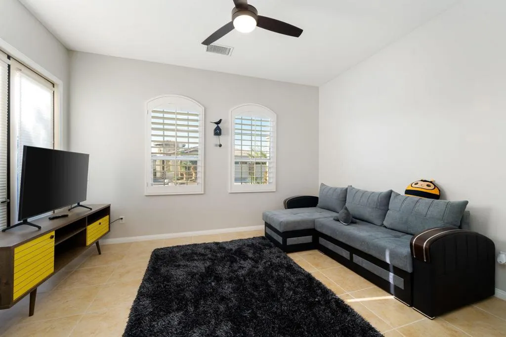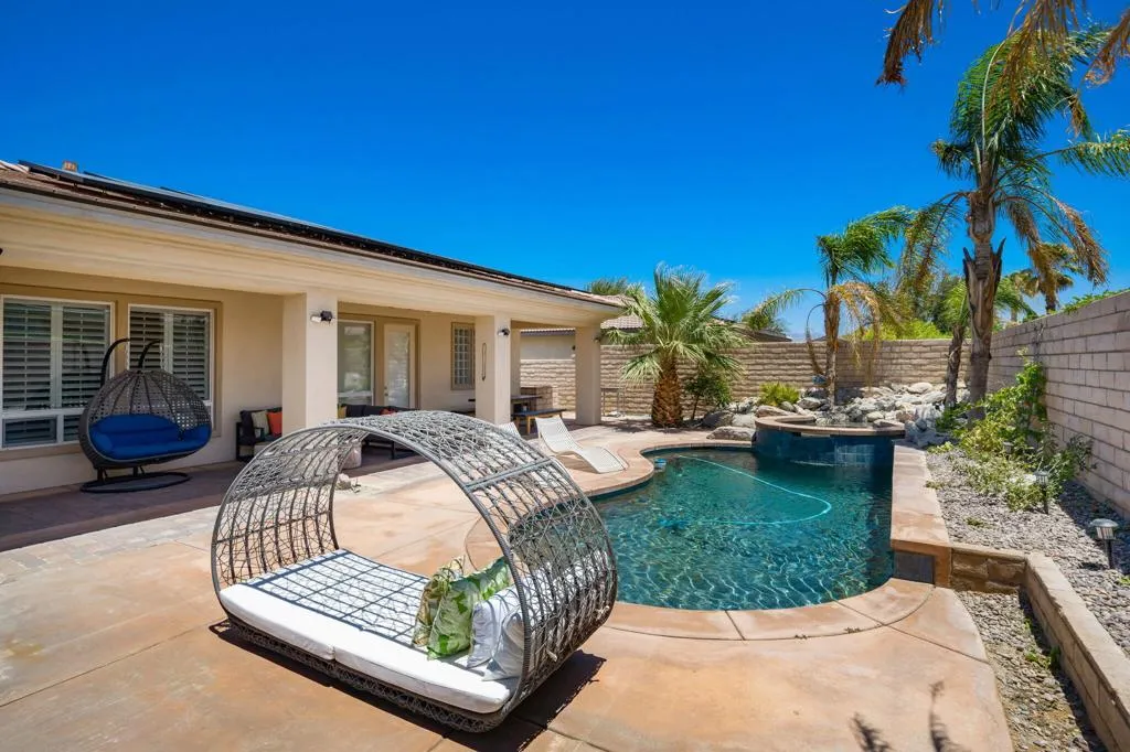 Located within the gates of Tuscany in Rancho Mirage, this pristine residence offers the perfect blend of comfort and sophistication. Designed for seamless indoor-outdoor living, the expansive covered lanai spans the length of the home, featuring ceiling fans, vibrant color-changing pool lighting, dual grills (charcoal and gas), and ample seating--ideal for entertaining under the desert sky. Inside, the home exudes timeless style with fresh interior paint, updated bedroom flooring, soaring 10-foot ceilings, and classic plantation shutters throughout. Energy-efficient solar adds modern convenience to this elegant retreat. Offering three spacious bedrooms and a versatile den that comfortably sleeps two, this home delivers refined desert living in one of Rancho Mirage's lowest priced HOA communities.