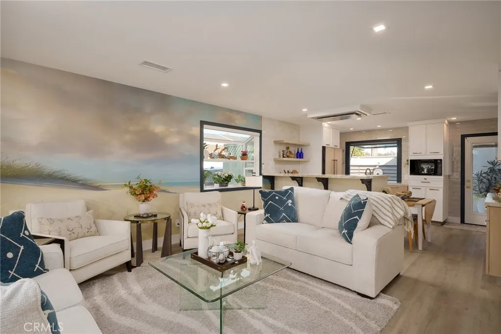 Thoughtfully remodeled coastal-modern home offered furnished with refined finishes and seamless indoor-outdoor living. The chef-grade kitchen features WOLF appliances, a panel-ready refrigerator integrated into custom cabinetry, quartz countertops with full-height backsplash, undermount sink with brass-tone fixtures, open shelving, soft-close cabinetry, and a large window overlooking the private courtyard—ideal for both everyday living and entertaining. The bright, open living area offers abundant natural light, consistent flooring throughout, and a statement stone fireplace with wall-mounted TV integration. The primary bedroom retreat includes a custom vertical wood-slat accent wall with integrated LED lighting, built-in nightstands, recessed lighting, and TV-mounting capability. The guest bedroom features a designer accent wall, pendant bedside lighting, and a built-in open closet system—perfect for guests, office, or flex space. The bathroom features a large walk-in glass shower with linear drain, rain shower head, and handheld fixture, designer tile with textured accent panels, a dual vanity with integrated sinks, modern cabinetry, brass fixtures, and designer mirrors. The fully enclosed private courtyard is a true outdoor living space, built on a concrete pad with large-format pavers, outdoor bar seating off the kitchen, fire pit area, and zero lawn maintenance—functioning as an extension of the interior living space. Additional upgrades include new HVAC system, new electrical, and new plumbing. Finished garage includes epoxy floors, extensive built-in shelving, custom base cabinets with butcher-block-style countertop, and washer/dryer. Strong curb appeal on a quiet residential street, minutes to Huntington Beach, shopping, dining, and easy access throughout Orange County.