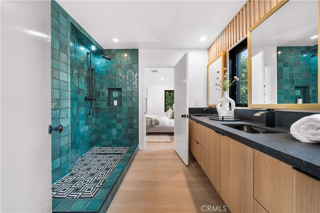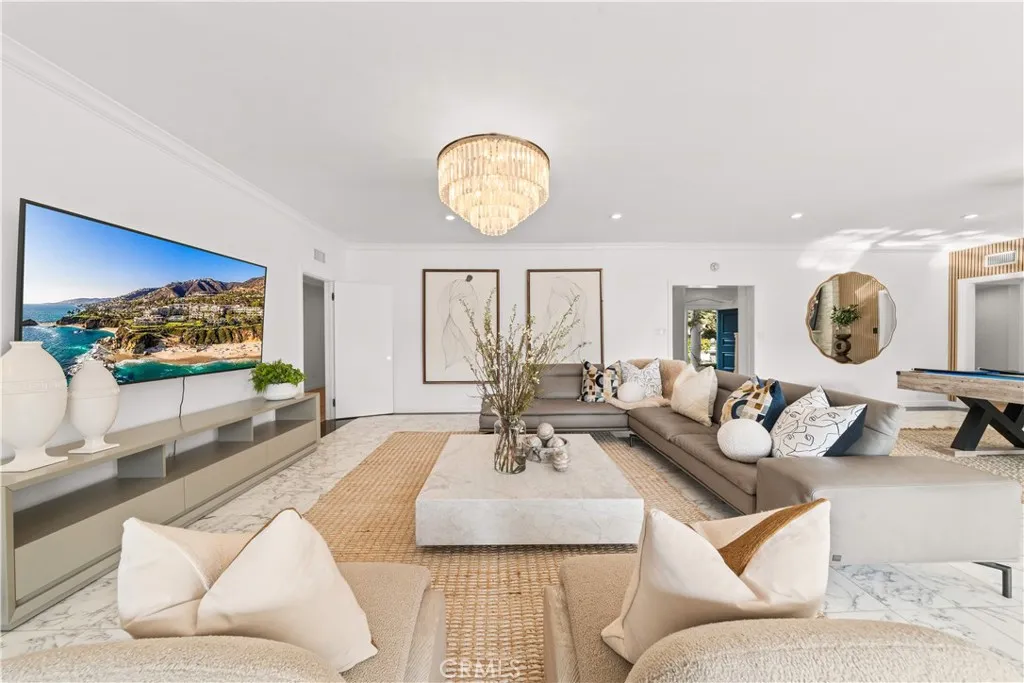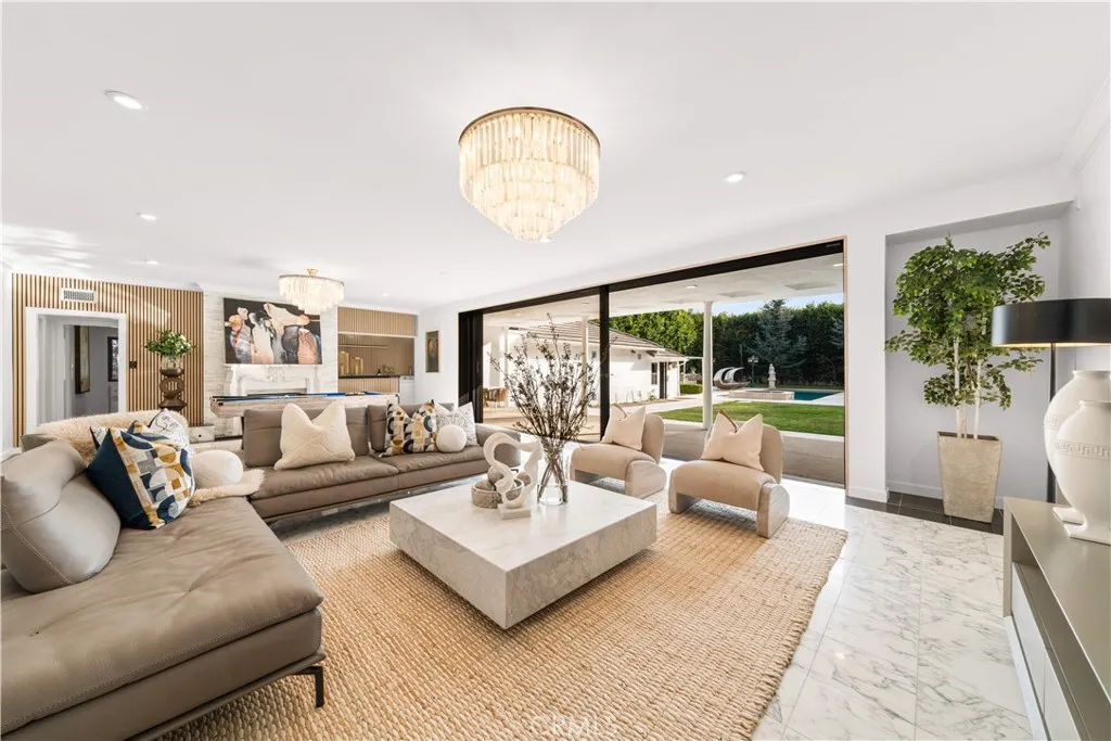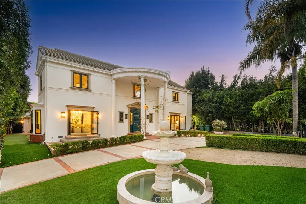 Situated on an expansive 0.43-acre lot, 701 Trenton Dr offers a two-story traditional residence with impressive curb appeal and a gated circular driveway accented by a fountain. The home features elegant living and dining rooms, along with a spacious family room with fireplace that opens through expansive glass doors to the private backyard, creating seamless indoor-outdoor living. The residence includes five bedrooms, with four located upstairs. The primary suite offers a sitting area, walk-in closets, and an oversized terrace with sweeping views toward Century City. Additional bedrooms are generously sized. The park-like backyard and yard space showcase mature landscaping, fruit trees, a resort-style pool, and a large BBQ area—ideal for entertaining, relaxing, and outdoor enjoyment. A chef’s kitchen with stainless steel appliances and breakfast area is complemented by a dedicated laundry and service wing, maid’s quarters, and a flexible bonus room. Additional features include a two-car garage and ample storage.