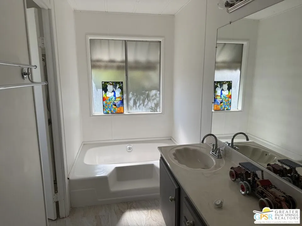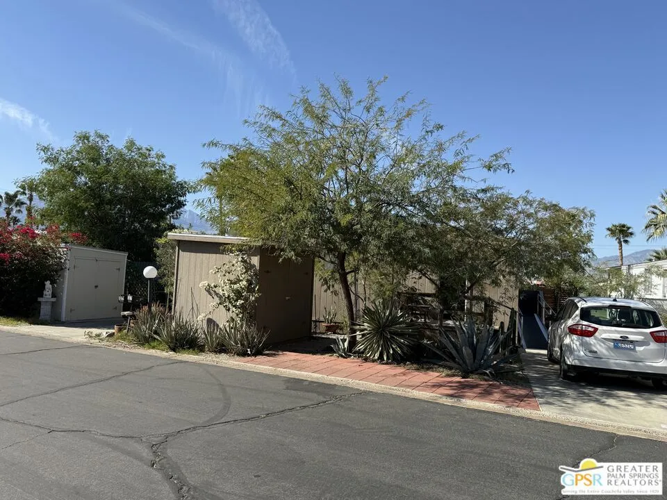 Don't miss this charming 2 bedroom/2 bath home, located on the golf course at Hidden Springs Country Club in Desert Hot Springs. Enjoy the awe inspiring mountain views, majestic sunsets, and savor your morning coffee and evening cocktails from your good sized covered deck. There is an open concept living area, and the well appointed kitchen boasts newer stainless appliances, and a large stainless sink. The primary bedroom includes an en suite bath with magnificent sunken tub and double vanity for ultimate relaxation. An aluminum ramp from driveway to door provides wheelchair access, or just an easy way to avoid steps. Laundry room with washer and dryer, an 8' x 8' shed for additional storage, and a separate fenced area thats perfect for pets, complete the package. Mature landscaping exudes tranquility and seclusion. Community amenities include tennis and pickleball courts, a sauna, a large swimming pool, two hot tubs, clubhouse complete with gym, pool table, and meeting area, and a dog park for your furry family members. Be sure to take a look at this one.