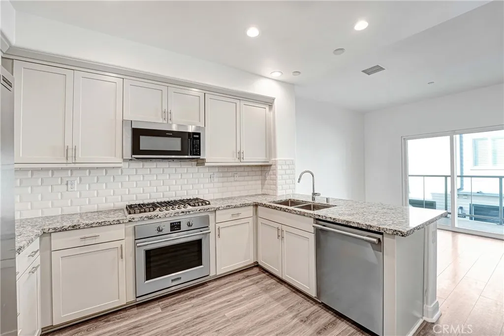 Sunlight pours through expansive windows and sliding glass doors that open to refreshing ocean breezes, filling the open-concept living and dining area with warmth and energy. The showpiece kitchen stuns with designer cabinetry, gleaming quartz countertops, a glass-tile backsplash, and premium stainless steel appliances—all brand new and still under warranty.