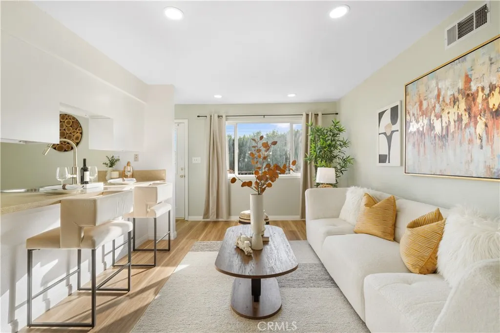 Welcome to this charming remodeled 2-bedroom, 1-bath, single-story end-unit condo located in the highly desirable Villa La Verne community. Tucked away in a peaceful setting surrounded by lush greenbelts, this home offers both comfort and privacy in a prime La Verne location. Step inside to a bright living space featuring new waterproof laminate flooring, new recessed lighting, and fresh interior paint throughout. The updated kitchen shines with new quartz countertops, new sink, pull-down faucet, new stove, and new range hood, creating a clean, modern space ideal for everyday living. The spacious bathroom has been remodeled with new tile flooring, new sink, light fixture. Residents enjoy a well-maintained community with resort-style amenities, including multiple pools and scenic walking paths. HOA covers water, sewer, trash, exterior maintenance, and master insurance, offering low-maintenance living style. This unit includes one shared garage parking and one driveway parking space, and ample guest parking nearby. Each building features a shared laundry room for added convenience. Located within the high-rated Bonita Unified School District. Las Flores Park is just steps away and offers tennis courts, pickleball courts, playground, and the La Verne Aquatics Center. Also only a few minutes from the University of La Verne, Old Town La Verne shops and restaurants. It is the home ready for you to move in and enjoy!