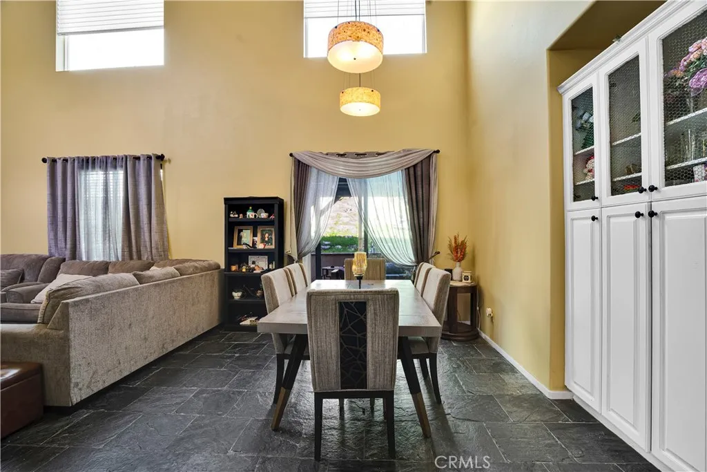 The open layout features soaring ceilings and seamless flow between the kitchen, family room, living room, and dining areas—ideal for both everyday living and entertaining. The chef’s kitchen is complete with a large center island, ample cabinetry, and abundant workspace.