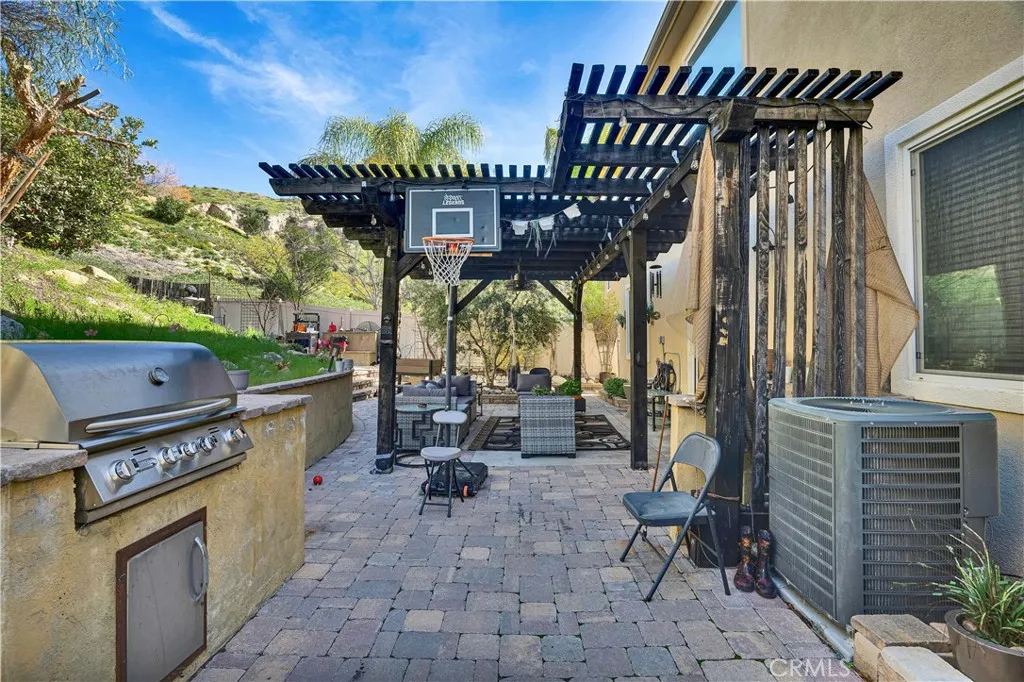 Outdoor living truly shines with a built-in grill, fire pit, stone pavers, and multiple seating areas—perfect for gatherings or relaxing evenings at home.