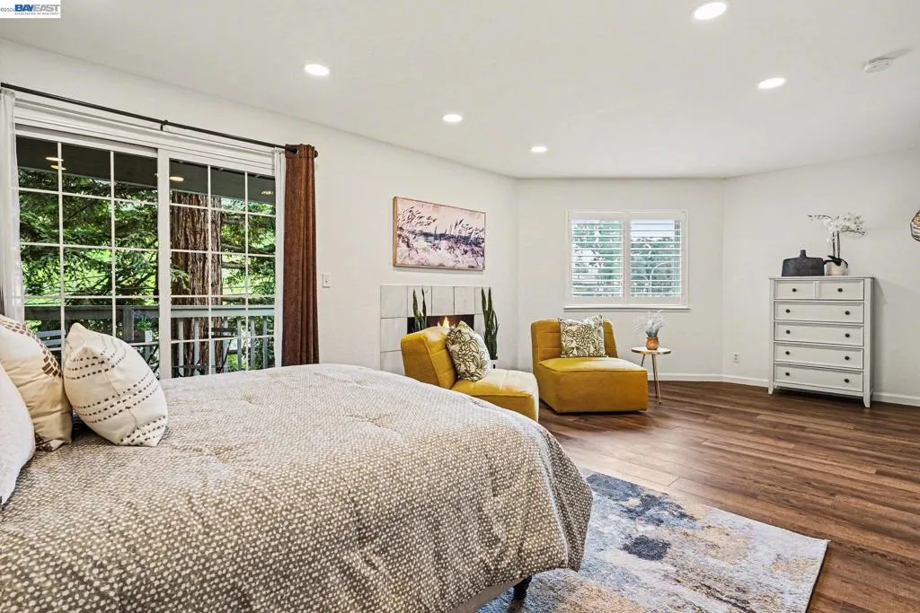 Stunning end-unit townhouse-style condo in a peaceful setting! This light-filled home features soaring ceilings, hardwood-style flooring throughout, and three balconies/decks. The spacious living and dining areas includes a cozy fireplace, while the updated kitchen offers white cabinetry, stainless steel appliances, quartz countertops, and classic subway tile backsplash. Recessed lighting and custom shutters add style throughout. The expansive primary suite features its own fireplace, a charming nook area, multiple walk-in closets, and dual vanity areas. A private secondary bedroom and bath includes a balcony and an adjacent flex space—perfect for a home office or exercise room. Additional highlights include an interior laundry room and a two-car garage. Ideally located near Walnut Creek’s shops and restaurants, with easy access to BART and freeways. Highly rated schools nearby complete this exceptional home. Open House 2/28 from 11am-4pm, and 3/1 from 1-3pm.