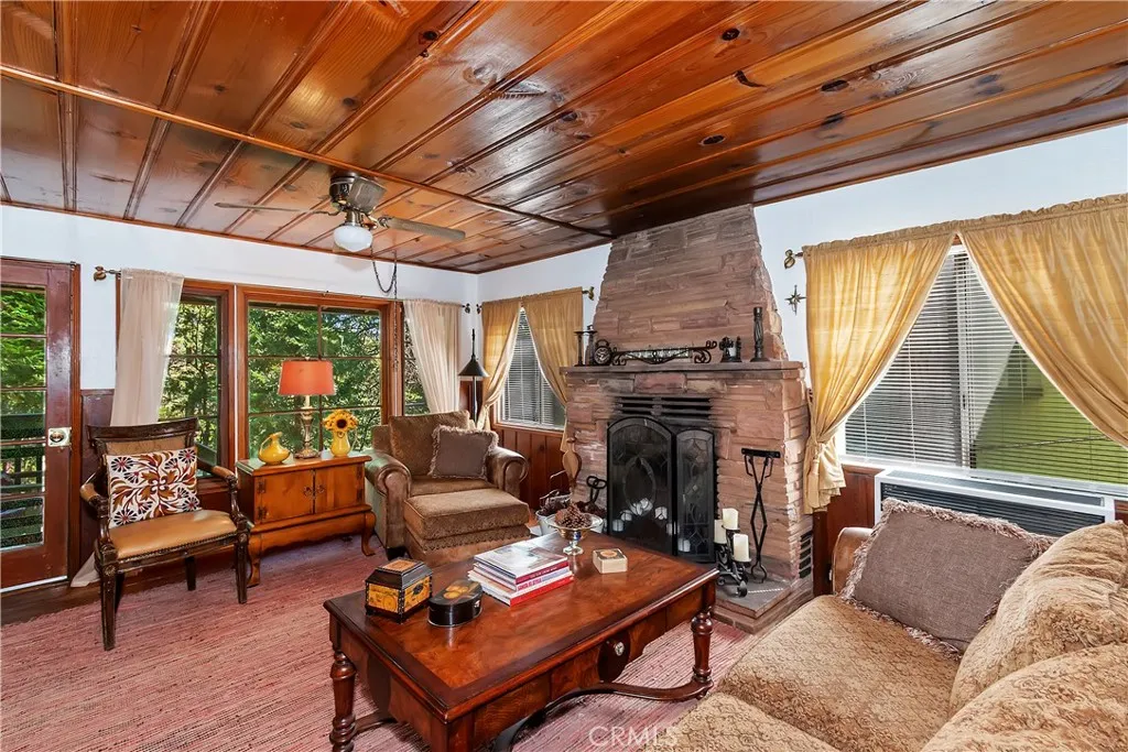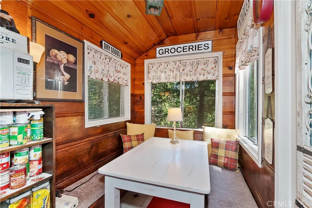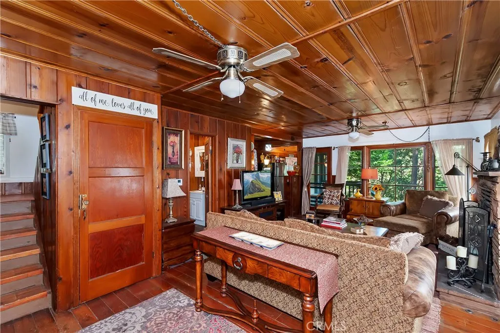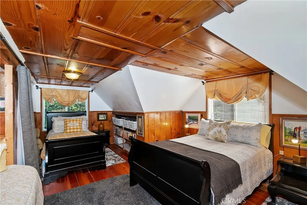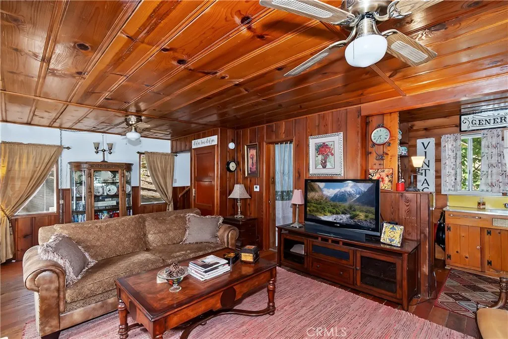 Vintage mountain charmer—Inside, original knotty pine paneling and wood floors create a warm, authentic mountain ambiance. Cozy one-bedroom, one-bath cottage . Plenty of large windows in the living room and dining area allow you to enjoy the inviting outside views. Galley kitchen with sitting area for meals .Upstairs is a large 1 bedroom space. Perfect as a mountain getaway or full-time retreat, this home offers a convenient location just minutes from downtown Crestline & beautiful Lake Gregory Regional Park, you’ll enjoy easy access to all the area has to offer. This vintage cabin sits on a generous gently sloping wooded lot. Whether you’re seeking a weekend escape or a quaint year-round residence, this cottage is the mountain retreat you’ve been looking for.