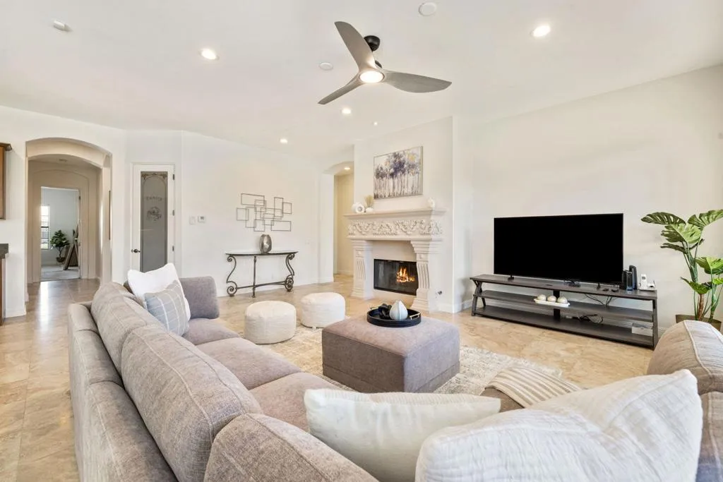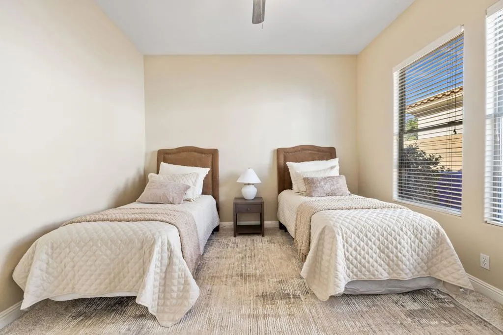 Welcome to Talante Retreat, a luxury seasonal or long-term rental home in the gated community of Talante in La Quinta! Spacious and beautifully appointed, this private desert retreat offers approximately 3,640 square feet on a single level with 4 bedrooms, each with its own en suite bathroom and walk-in closet, plus a dedicated den/office with custom built-in cabinetry and a formal dining room. Ideally located just minutes from the Empire Polo Grounds, Indian Wells Tennis Garden, world-class golf courses, shopping, dining, and entertainment, this home places you in the heart of La Quinta while still offering a peaceful, private sanctuary.Enter through the grand wrought-iron double doors to an elegant interior featuring travertine flooring, coffered ceilings, and expansive living areas designed for both entertaining and relaxing. The spacious layout offers ideal separation and privacy with a highly sought-after split floorplan, creating a comfortable retreat for family and guests alike. The primary suite serves as its own private haven, complete with a sunroom perfect for morning coffee, reading, or unwinding at the end of the day.The generous living spaces are perfect for gathering with friends or enjoying quiet time at home. The formal dining room anchors the main living space, while the thoughtfully designed layout flows seamlessly throughout the home.Step outside to your own private desert oasis set on a spacious cul-de-sac lot. The backyard features a newly constructed pool surrounded by lush landscaping, creating a tranquil space to relax, soak up the sun, and enjoy the La Quinta lifestyle year-round.Additional highlights include a three-car garage, low HOA dues, and fresh interior paint throughout. Offered furnished or unfurnished and move-in ready, this exceptional Talante home delivers the perfect blend of luxury, comfort, and privacy in one of La Quinta's most desirable gated communities. Variable seasonal rates apply.