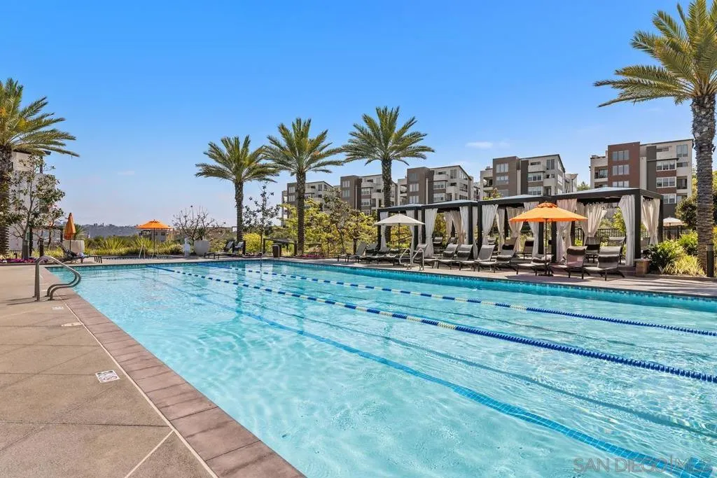 HUGE YARD! Premier location - Welcome to this rare 2-STORY residence offering a FULL BED AND BATH ON ENTRY level, in-unit laundry, and an attached two-car garage with EXTRA built-in storage. Featuring one of the LARGEST YARDS in the entire community, one of only two this size (~450 sf, nearly twice the size of other yards), this home enjoys exceptional privacy with no rear neighbors and a peaceful front-facing balcony view. Inside, the home is beautifully upgraded with a stunning kitchen featuring quartz countertops, stainless steel appliances, custom designer lighting, window shades, and upgraded bathrooms throughout. Upstairs are two ensuite bedrooms, including a spacious primary suite with a walk-in closet. Promontory residents enjoy resort-style amenities including pools and spas, a lap pool, private cabanas, fire pits, BBQ and picnic areas, dog park, clubhouse, gym, game rooms, and lushly landscaped common areas, all just steps from Civita’s shops, restaurants, and trails. A rare opportunity to own a low-maintenance home with an exceptional outdoor space in one of San Diego’s premier master-planned communities.