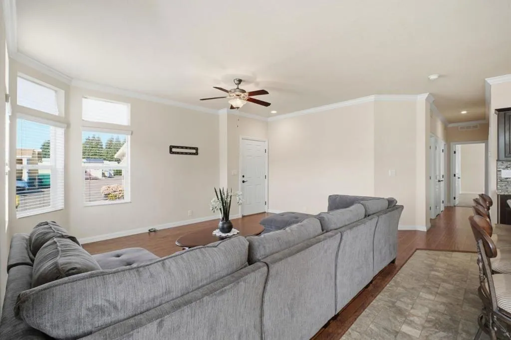 This beautiful 3-bedroom, 2-bath mobile home is situated in a desirable 55+ senior community in Hayward, offering a perfect blend of comfort, style, and convenience. The home features a bright, open floor plan with large windows, laminate flooring, and recessed lighting throughout, creating a warm and modern atmosphere. The gourmet kitchen is ideal for everyday living and entertaining, equipped with stainless steel appliances, granite countertops, ample cabinetry, and a pantry. Two additional bedrooms provide comfortable space for guests, hobbies, or a home office. The kitchen appliances, washer, dryer, and a small refrigerator are all included. Conveniently located near Edenvale Gardens Regional Park, Target, Lowe's Home Improvement, public transit, restaurants, and grocery stores, this home offers low-maintenance living in a welcoming community.