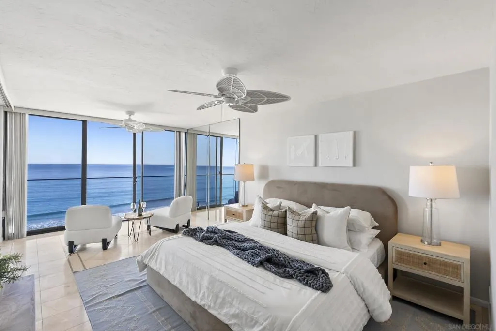 Enjoy remarkable floor-to-ceiling views of breaking waves, the coastline, and unforgettable sunsets from this premium high-floor 2-bedroom, 2-bath waterfront condo in North Pacific Beach. Beautifully maintained, the residence features custom tile flooring and beach-friendly finishes throughout, with an open-concept kitchen and breakfast bar that flows seamlessly into the great room overlooking the Pacific. Glass railings and a Juliette balcony create an effortless connection to San Diego’s ocean breezes and year-round coastal climate. The primary suite captures sweeping water views, while the secondary bedroom offers easterly vistas across Pacific Beach to the distant mountains. The home includes one garage parking space in an exceptionally convenient, easy-to-park location suitable for most SUVs. One of the few high-rise buildings directly along San Diego’s shoreline, The Capri by the Sea offers resort-style amenities including fob access, an attended lobby, elevators, pool and spa, beach shower, sauna, and a rooftop deck with BBQs. The building is also among the limited beachfront properties that allow short-term rentals. Public beach access by ramp is located directly in front of the building along the boardwalk.