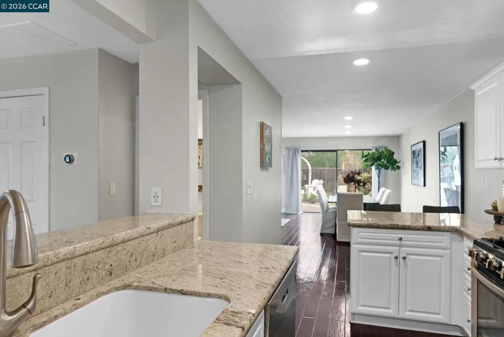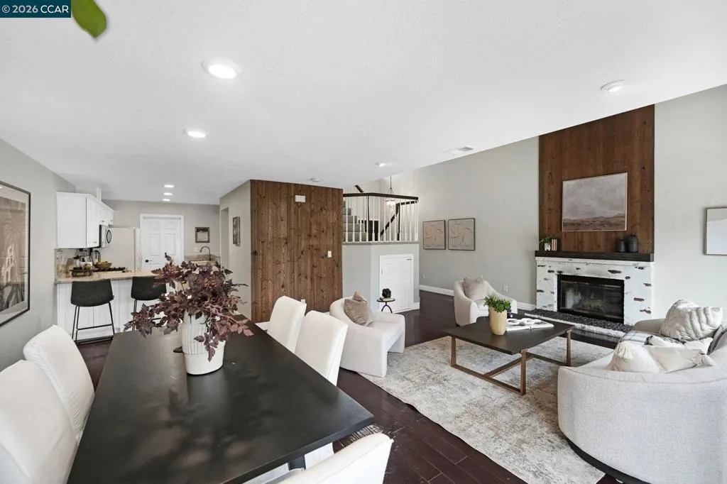 Located in Danville’s highly desirable Brookview community, this stunning end-unit residence offers approximately 1,946 sq ft of thoughtfully designed living space, featuring 4 bedrooms and 2.5 bathrooms. The spacious living area showcases vaulted ceilings, a custom floor-to-ceiling wood-clad statement fireplace with a whitewashed brick surround and rustic wood mantel, and sliding glass doors that open to the expansive backyard with peaceful hill views—creating seamless indoor-outdoor living. A versatile flex space just off the kitchen provides the perfect setting for additional seating or a comfortable work-from-home area. Enjoy the rare combination of one of the largest yards in the community, no rear neighbors, and only one shared wall—offering exceptional privacy and a near-detached living experience. Designer finishes shine throughout, including updated kitchen and bathrooms, engineered hardwood floors on the main level, and newer premium carpet upstairs. Move-in ready and beautifully appointed, this home also offers access to scenic walking trails, a community pool, and clubhouse—delivering an elevated lifestyle in the heart of Danville.