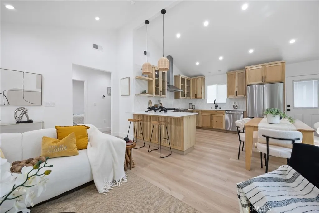 The main residence at 2460 Stoner Ave features 2 bedrooms and 2 bathrooms across 865 square feet of thoughtfully designed living space, including custom white oak cabinetry and woodwork.