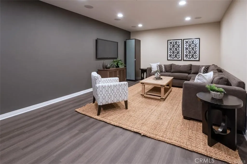 Designer perfect end unit townhome. Direct access 2 car garage features an attached bonus room (app. 300 sq ft.), not included in square footage, which is a completely finished entertainment room with cabinetry, TV hookups and furnishings. Brazilian cherry hardwood floors, wine frig, and private patio make for great entertaining in the large living room, wired for surround sound. New carpet just installed with upgraded padding. Entire interior has just been professionally painted and cleaned. Beautiful kitchen with granite countertops and stainless steel appliances. Refrigerator and Samsung washer and dryer included, without warranty. Spacious Primary Bedroom features a huge walk-in closet with built-ins, plus an additional large separate closet with built-ins.
