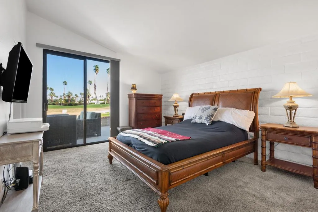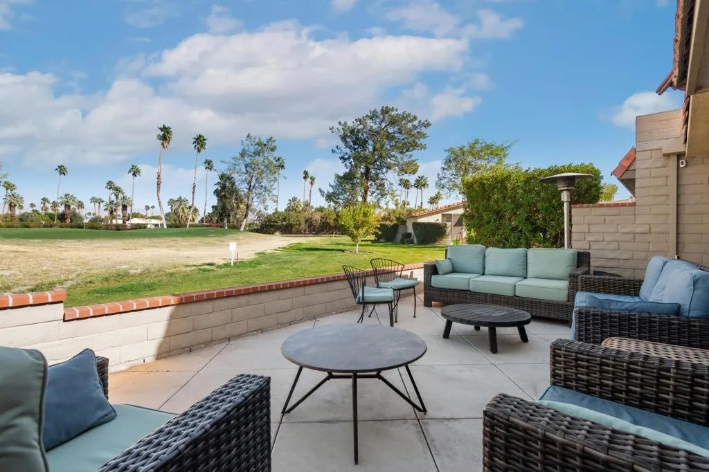 INCREDIBLE PRICE for effortless desert living in the highly desirable Cathedral Canyon Country Club! This bright and inviting 2-bedroom, 2-bath condo welcomes you with a lush private courtyard and spacious interior filled with natural light. Vaulted ceilings, fresh paint, new blinds, updated lighting, and three sets of sliding doors create seamless indoor/outdoor flow. Enjoy tranquil golf course, pond, and mountain views from the expansive rear patio--perfect for relaxing or entertaining. The open living and dining areas connect to a beautifully remodeled kitchen featuring white cabinetry, new appliances, updated lighting, sleek countertops, tile backsplash, and a charming breakfast nook with courtyard access. The primary suite offers vaulted ceilings, generous closet space, patio access, and an updated ensuite bath. The guest bedroom features its own remodeled private bath and courtyard access, ideal for guests. Additional highlights include a full-size stacked washer/dryer, pantry storage, direct access to a two-car garage, leased solar, and updated HVAC. Community amenities include pools, spas, and beautifully maintained grounds. Ideally located near shopping, dining, golf, and downtown Palm Springs. Exceptional value in a premier golf course community!