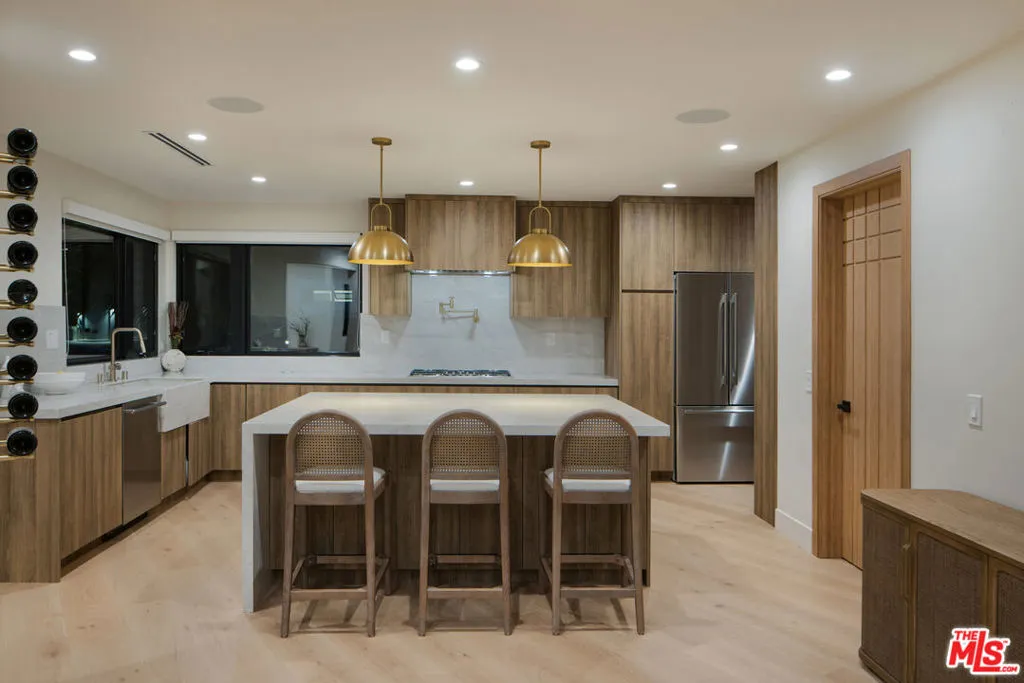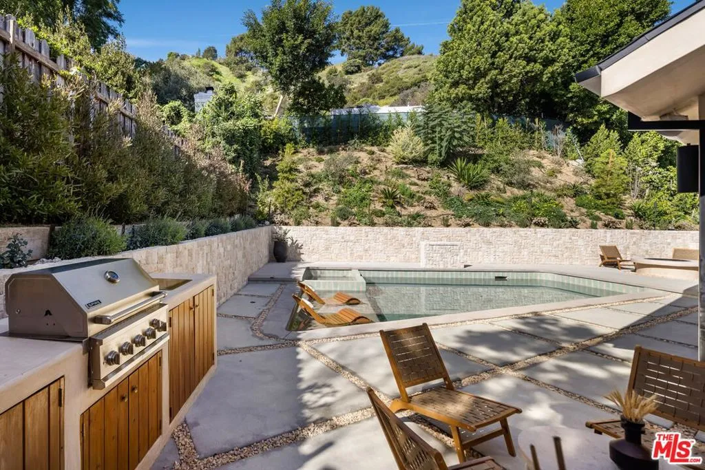 Nestled in the coveted hills of Sherman Oaks, this fully renovated contemporary home offers 4 bedrooms and 3.5 baths with the perfect blend of luxury, style, and functionality. Step through custom double entry doors into an elegant living space highlighted by a stunning travertine porcelain slab fireplace and soaring 11-foot ceilings - wide-plank engineered wood floors flow throughout, while each bathroom showcases a refined Roman clay finish. Expansive Fleetwood sliding doors open to a private resort-like backyard with pool, spa, custom ledger stone throughout, a Pentair system and a full outdoor kitchen including a built-in barbecue, sink, and refrigerator surrounded by mature ficus throughout, ideal for effortless entertaining. This smart home is fully integrated with advanced RTI and ADT systems, featuring upgraded switches, Episode speakers, security cameras, and a premium whole-house audio setup. Thoughtfully designed and move-in ready, this home caters to the most discerning buyers seeking a turnkey, fully furnished sanctuary in one of the Valley's most desirable neighborhoods.