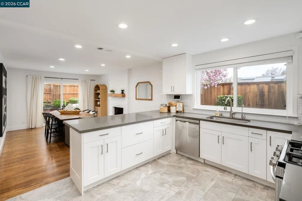 Tucked into one of San Ramon’s most connected neighborhoods, this Northeast-facing single-story rancher offers a warm, welcoming feel from the moment you arrive. A lush front lawn & covered patio set the tone, while natural light highlights stained hardwood floors & a calm, neutral palette throughout. The open kitchen sits at the heart of the home, w/ white shaker cabinetry w/ soft-close drawers, stone countertops, stainless steel appliances, a pantry, & a breakfast bar that invites gathering. It flows seamlessly into the dining area, anchored by a brick hearth fireplace & sliding glass doors that open to the backyard. The living/family room includes recessed lighting & a built-in entertainment system. The primary suite offers mirrored closet doors & an ensuite bath w/ tile flooring, a stall shower, & stone vanity. 3 additional bedrooms are generously sized, including one w/ direct backyard access. Outside, the backyard features a wrap-around paver patio, lush lawn, lemon & apple trees, & a large side yard w/ RV/boat parking. Additional features include a newer composition roof (2022) & two-car garage. Just minutes from Pine Valley Middle School & Boone Acres Park, w/ quick access to I-680 & the Iron Horse Trail, this home offers comfort, flexibility, & everyday convenience.