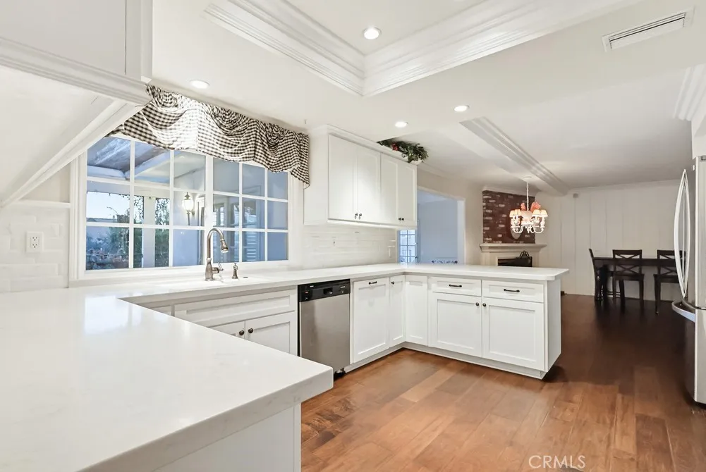 The living room and kitchen showcase coffered ceilings with recessed lighting along with a cozy gas fireplace featuring a brick hearth and wood mantle, creating an inviting central gathering space. Beautiful wood flooring flows throughout the kitchen, dining, and family room areas, enhancing warmth and continuity throughout the main level.